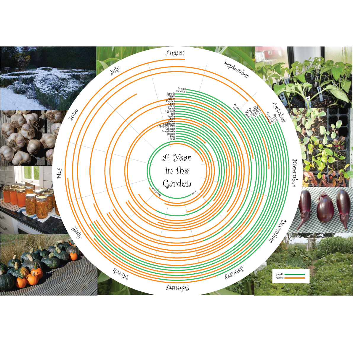 I tried to capture some of the garden year’s seasonality in this little graphic. It includes most of the annual crops we grow, though some are lumped together and others left out to minimise clutter. None of the perennial crops are included. But I hope it gives you an idea of what’s in and coming out of the garden at different times of year.