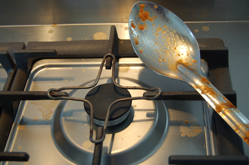 The stove, and the wall behind it is splattered with tomato sauce. The floor is littered with bits of onion skin, lost basil leaves, and sesame seeds. The backsplash behind the sink is splattered with dirt.