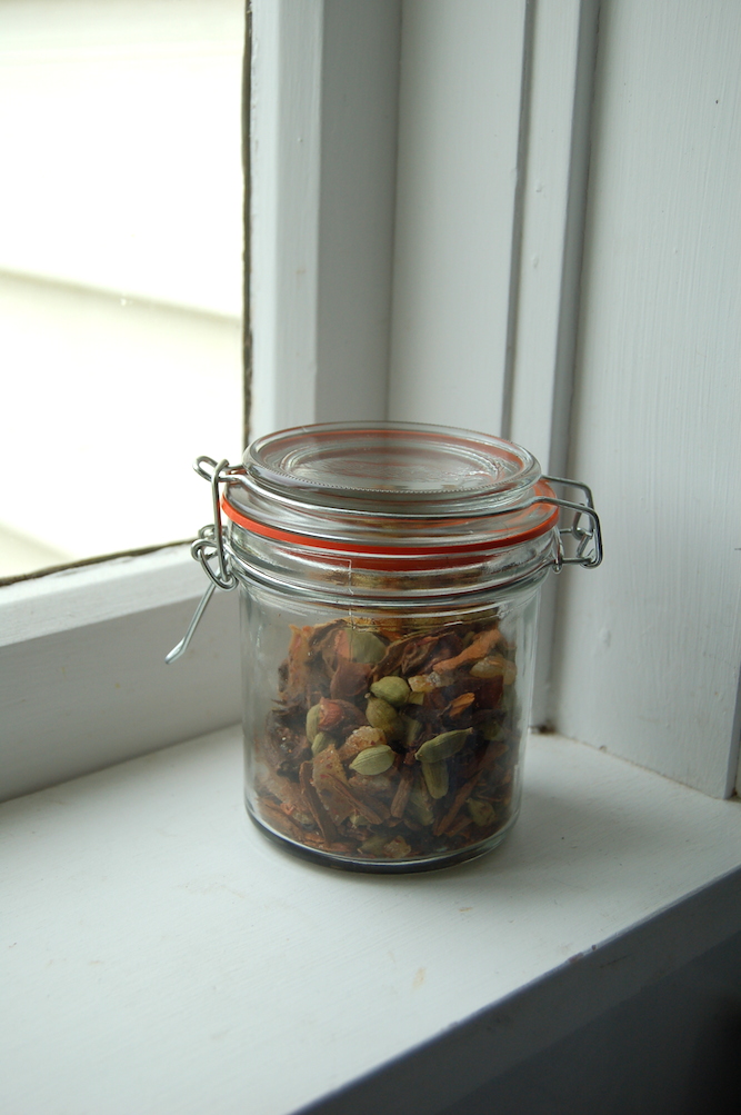 My current favourite tea is a homemade chai my husband gave to me at Christmas. I had been making up individual cups of chai for us, plonking various spices into the cup individually, but some days it was too much work to search through the cupboard for all the right spices. Ian’s chai mix makes a cup of chai as easy as a tea bag. A scant spoonful of his mix makes a wonderfully spicy cup to warm up even the wettest of days. The mix includes candied ginger, hot pepper flakes, stick cinnamon, cardamom pods, whole cloves, and star anise. And the best part of it is the spicy Christmas-baking smell it leaves in the house long after the last sip has been drunk.