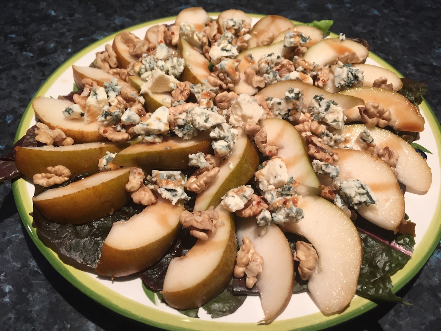 If I can hide it until dinner, though, I love blue cheese in a salad with pears and walnuts. The combination of bitter greens, sweet fruit, and sharp salty cheese hits all the right buttons. We usually top it with a bit of vinaigrette, but this time we simply drizzled some pomegranate syrup over it. Divine!