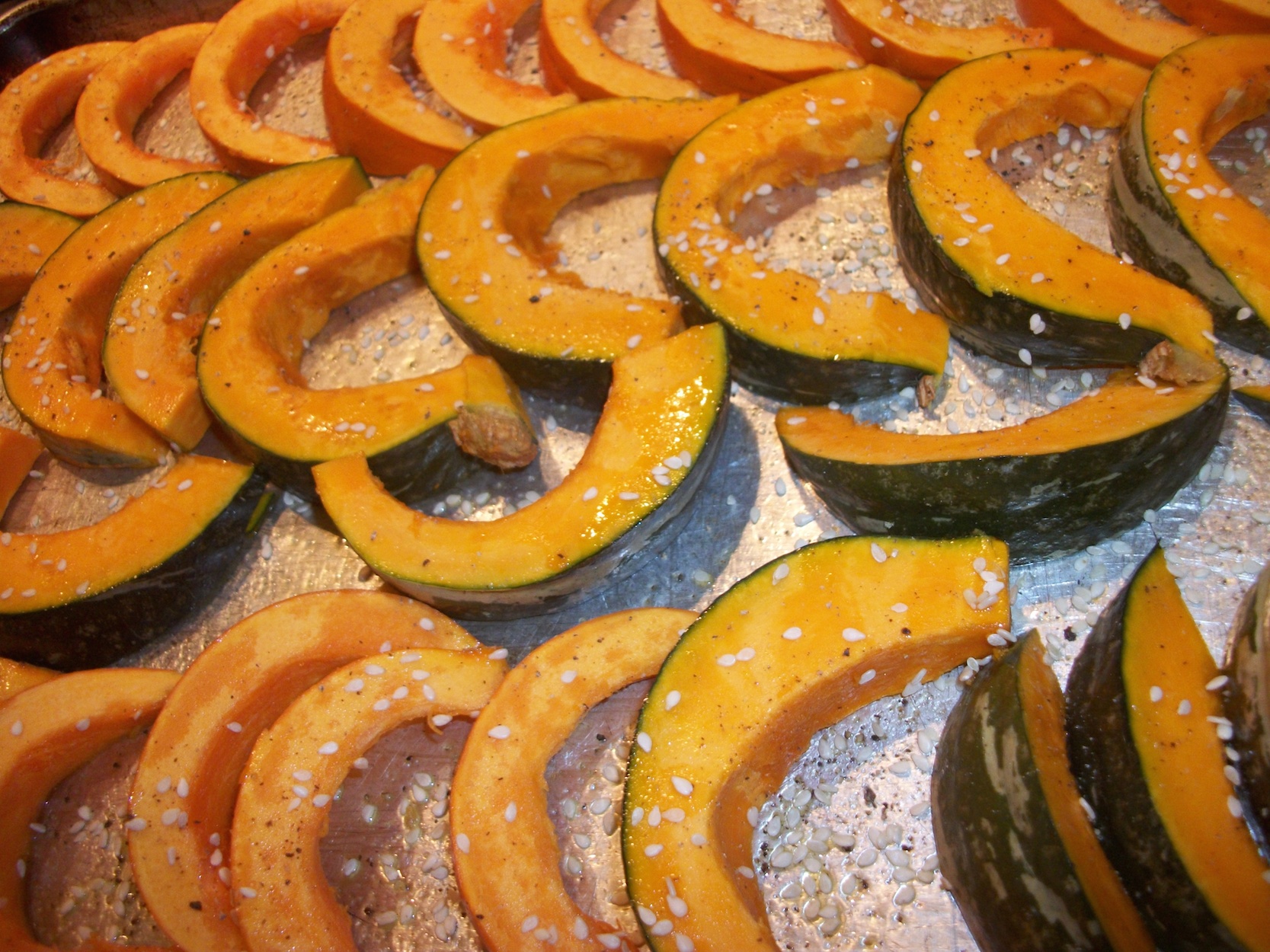Halve a pumpkin or other winter squash. Scoop out the seeds. Slice each half into wedges about 1.5 cm thick. Place on an oiled baking sheet, flipping each slice once to make sure it’s coated with oil on both sides. Sprinkle with coarse salt, freshly ground pepper, and sesame seeds. Bake at 190°C (375°F) for 20-30 minutes.