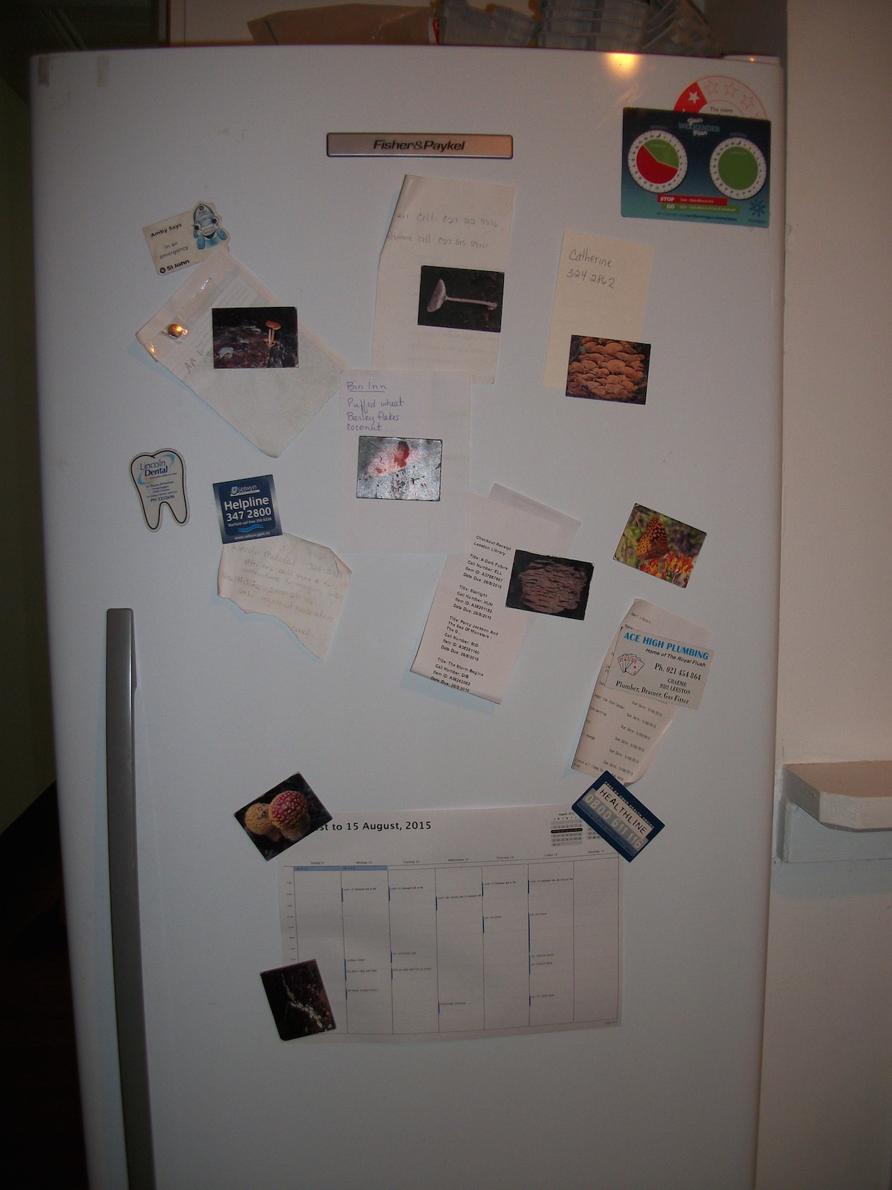 The front of the refrigerator is plastered with magnets from various businesses and organisations. The magnets hold up the critical documents that form the command centre of the house:
