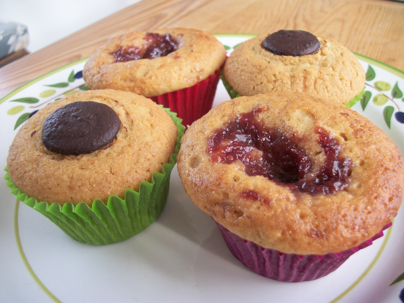 I love PB & J sandwiches. So why not a PB & J cupcake? I’ve never tried this before, and I was a little worried it wouldn’t work, so when I made peanut butter cupcakes last night, I only put jam in half of them (chocolate buttons on the other half). But next time, I’ll do them all with jam!