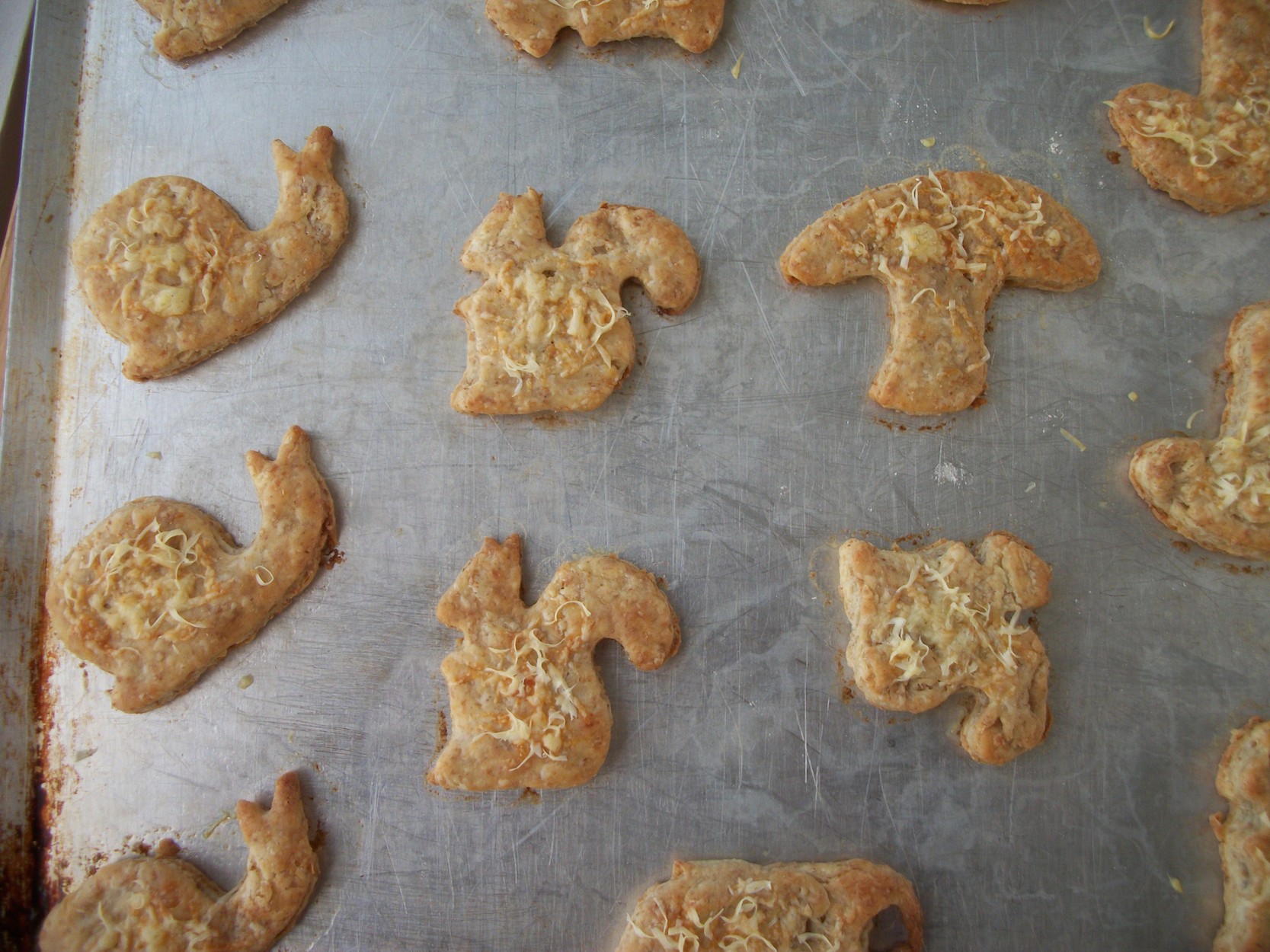 I rolled the dough out as if for a pie, then cut it into shapes with cookie cutters. After I placed the shapes on a baking sheet, I sprinkled them with grated parmesan cheese, and baked them at about 200C (400F) until they were brown and crispy (10-15 minutes…I didn’t really look at the time).