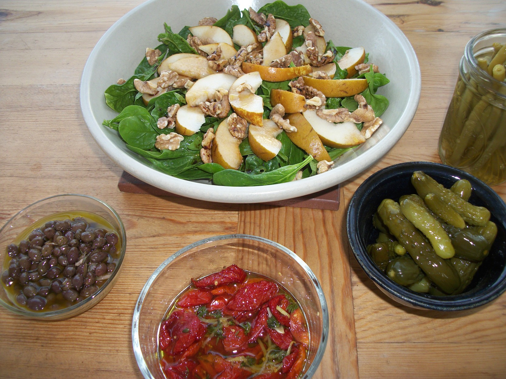 We picked up a few fancy cheeses from Barry’s Bay Cheese on the way home. Added some homemade sourdough bread; home grown olives, dried tomatoes, dilled beans, and sweet gherkins; and a salad made with the last of the winter spinach—a veritable feast!