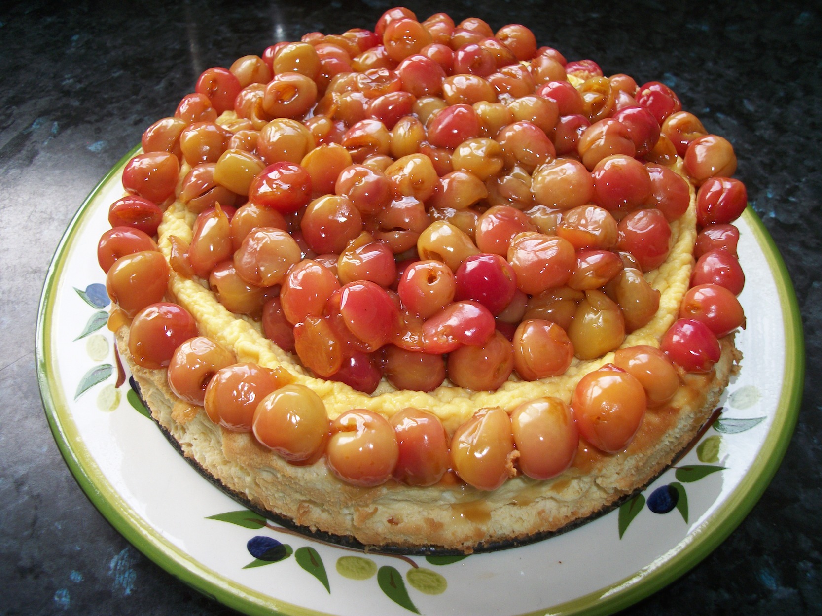The ricotta cheesecake—essentially a sweet soufflé—puffed twice the height of the pan in the oven, then fell most unattractively when it cooled. But it left a perfect rim for holding cherries.
