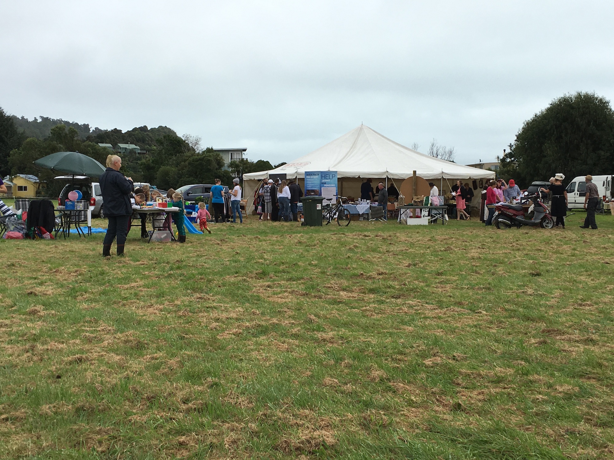 About 10.30, the bouncy castle was inflated, and half a dozen kids tumbled around on it. We bought a coffee from a food truck that had parked on the edge of the commons and some baked goods from some girls who had set up a table on the lawn. There was a woodworker, the local scout troupe, a few Department of Conservation staff, some locals selling second-hand goods, a knitter selling baby sweaters, a woman selling jam and goat cheese…And very few customers.