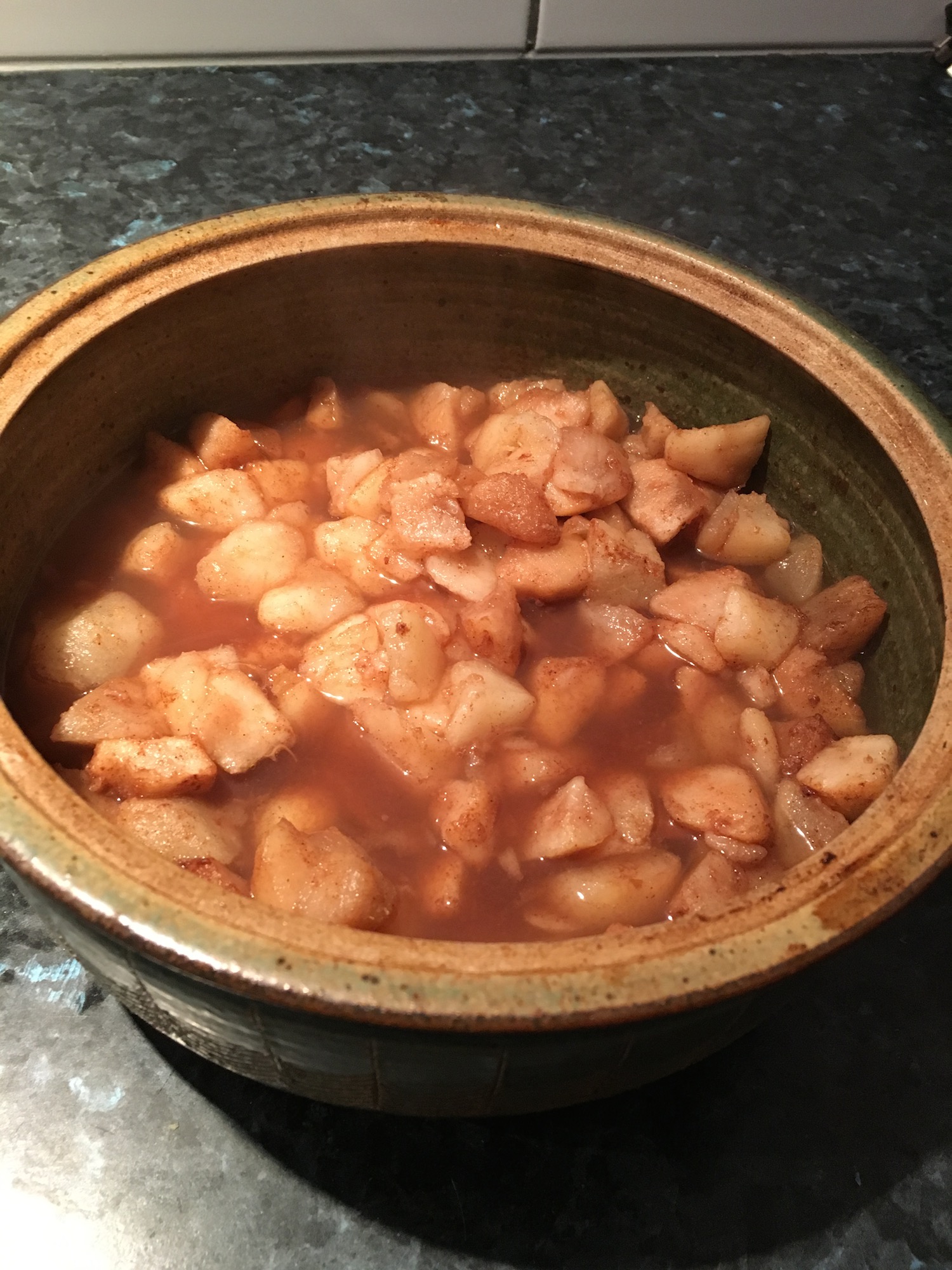I filled a casserole dish with peeled and cubed pear, added a few tablespoons of honey and a similar quantity of lemon juice, sprinkled it generously with cinnamon, and baked it for 45 minutes at 190°C (375°F).