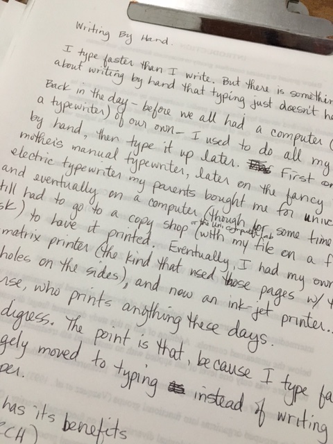 Back in the day—before we all had a computer (or even a typewriter) of our own—I did all my writing by hand, then typed it up later. First on my mother’s manual typewriter, later on the fancy ‘portable’ electric typewriter my parents bought me for university, and eventually on a computer (though for some time I still had to go to a copy shop or the university computer lab with my file on a floppy disk to have it printed). Eventually, I had my own dot-matrix printer (the kind that used those cool pages with the feed-holes down the sides), and now an ink-jet printer. Of course, who prints anything these days…