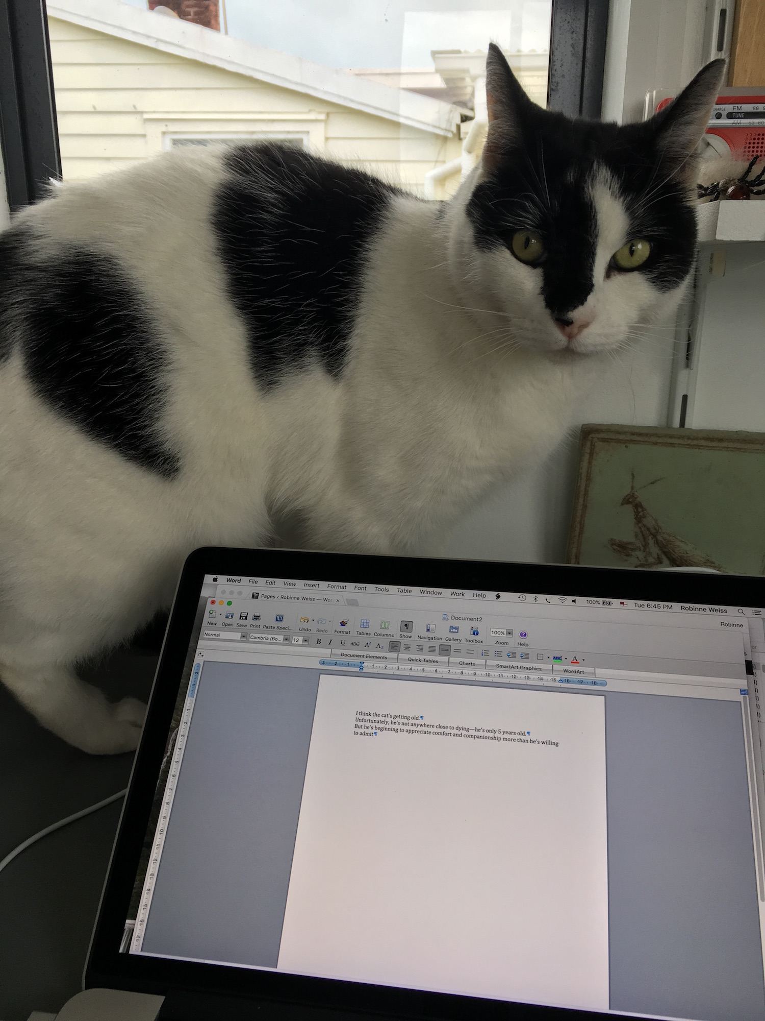 And a couple of weeks ago, the evening after I came home from several days away, he jumped up onto the couch with me, and curled up as close as he could—practically on my lap–purring loudly.