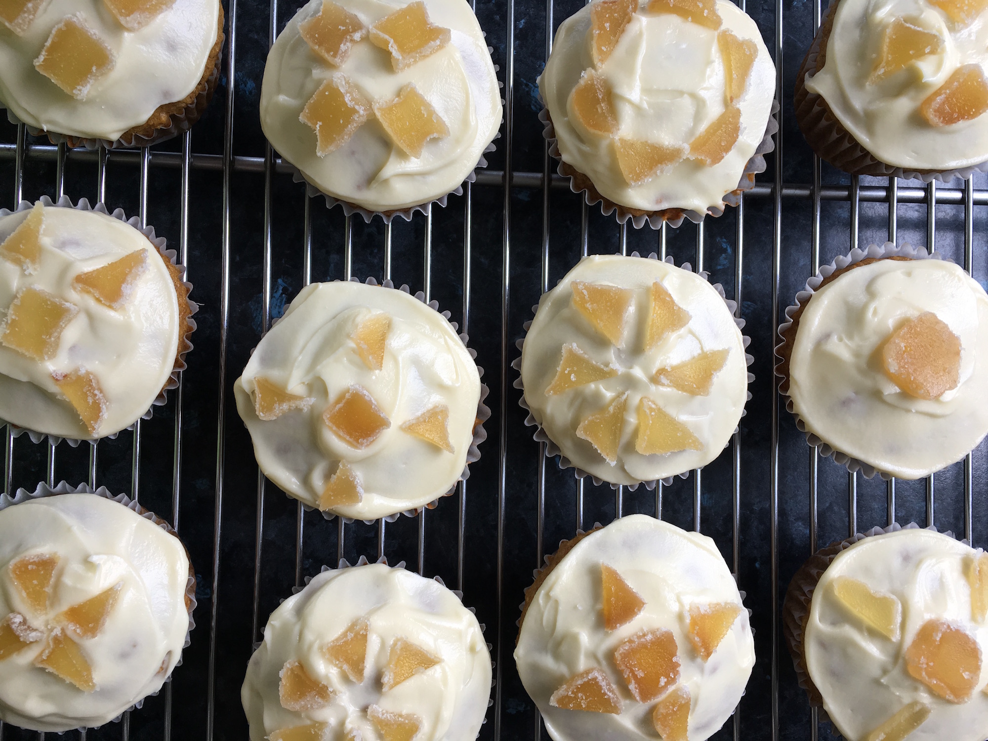 Cool completely, then frost with cream cheese frosting and decorate with crystallised ginger.