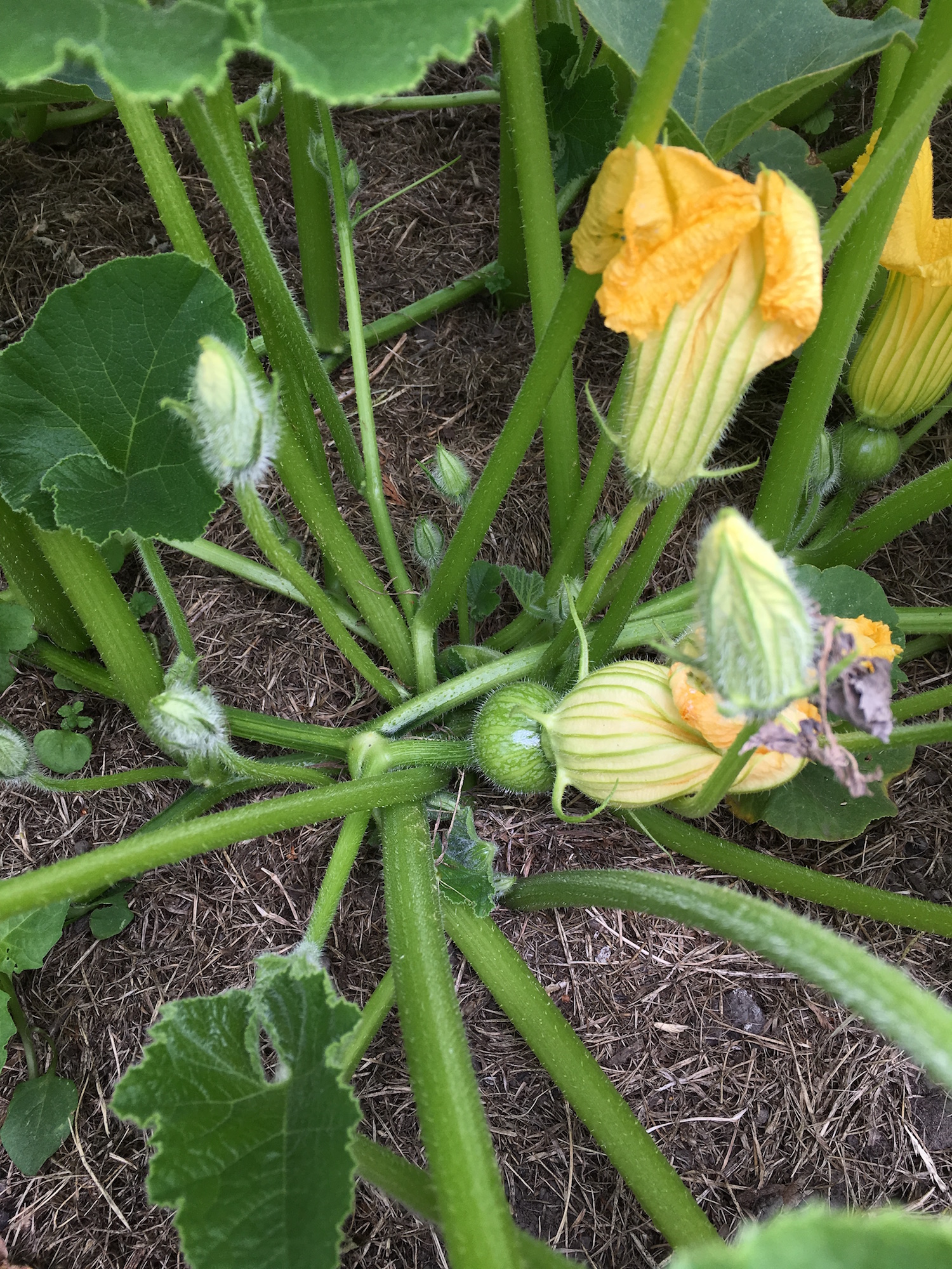 I don’t know whether to be thrilled or annoyed. Winter squash germination was awful this spring, and then the plants got hit by frost. But the summer squash bed escaped the frost. So instead of having none of my favourite pumpkins, I have half a dozen healthy plants. And it also means I have six fewer zucchini plants, which is most definitely a bonus, because I always plant too many zucchinis.