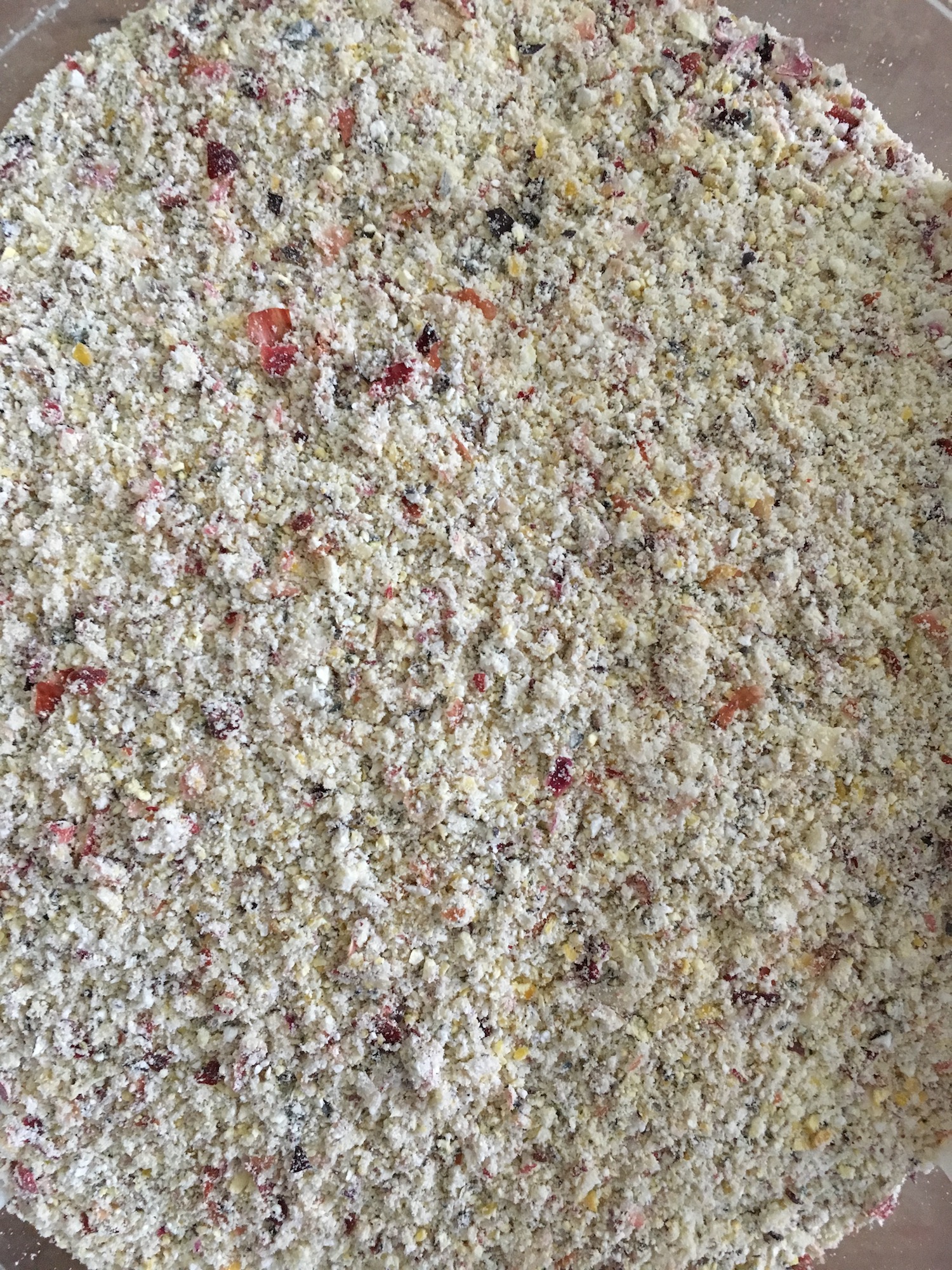 It ground quite nicely in our coffee grinder (well-cleaned, first). I was a bit disappointed to note that the interior of the kernels was white. The resulting cornmeal wasn’t the rosy colour I’d hoped. Instead it was flecked with colour–confetti cornmeal.