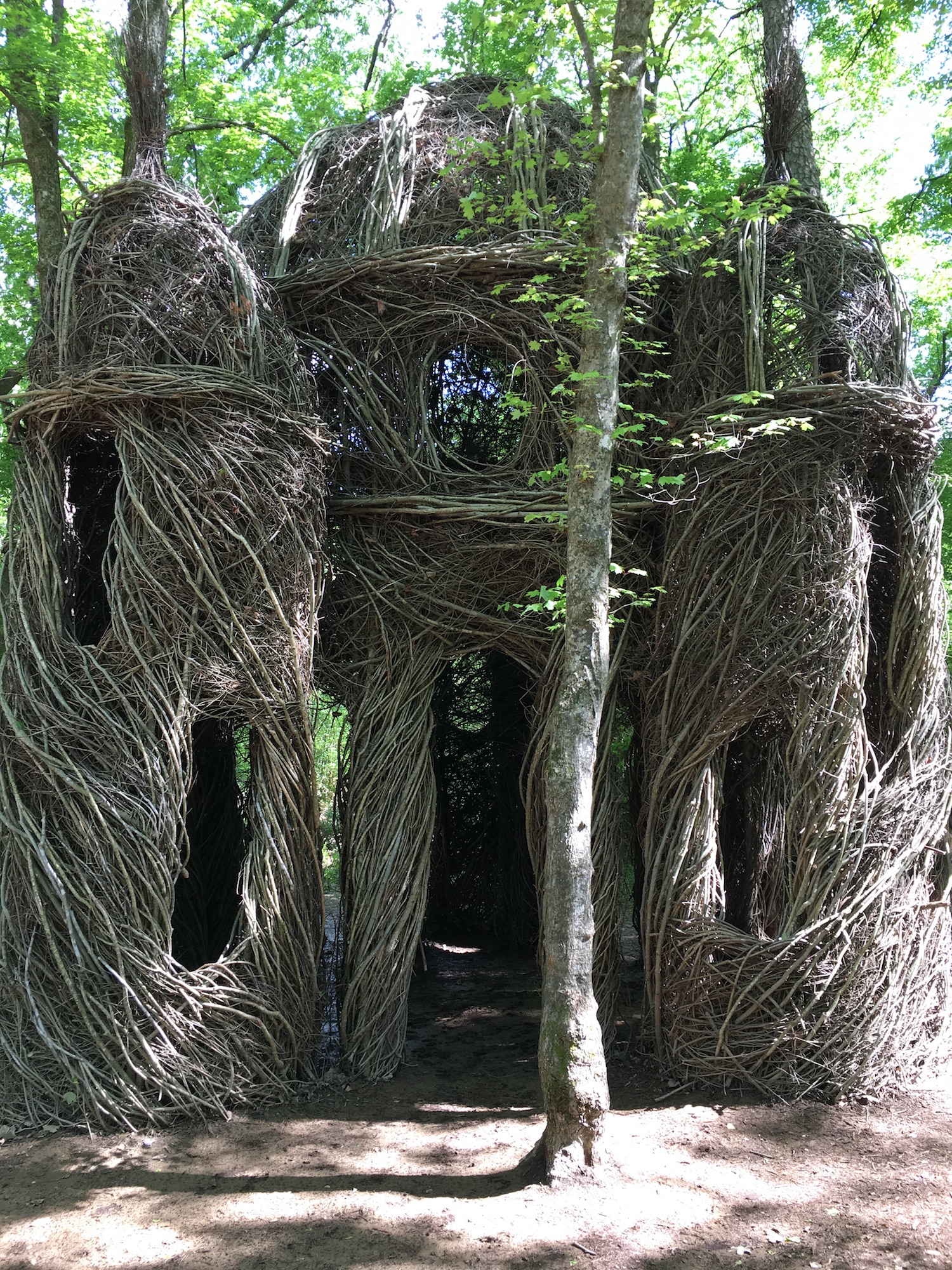 Patrick Dougherty is a North Carolina artist who builds amazing structures from tree saplings and sticks. His works are remarkably detailed. They evoke movement with their swirling lines and often skewed shapes. They provoke thought and reflection. Most of them invite you in, to experience them inside and out. And, by nature, they are ephemeral.