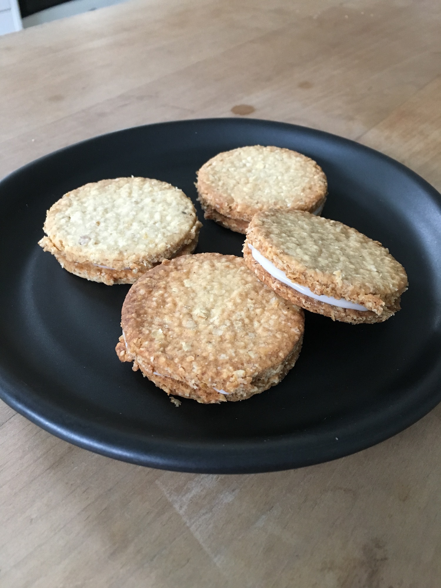 So it was time to bake again. Something involved. These subtly flavoured crunchy oat thins were just the thing. The difficult-to-work-with dough took extra time and care to mix and roll out. The fragile unbaked cookies had to be handled with care. And the filling of them to create beautiful sandwiches had to be done with gentle precision.
