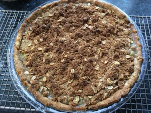 Pour gooseberries into the pie dough. Sprinkle streusel on top. Bake at 190ºC (375ºF) for 30 minutes. Cool completely before cutting.