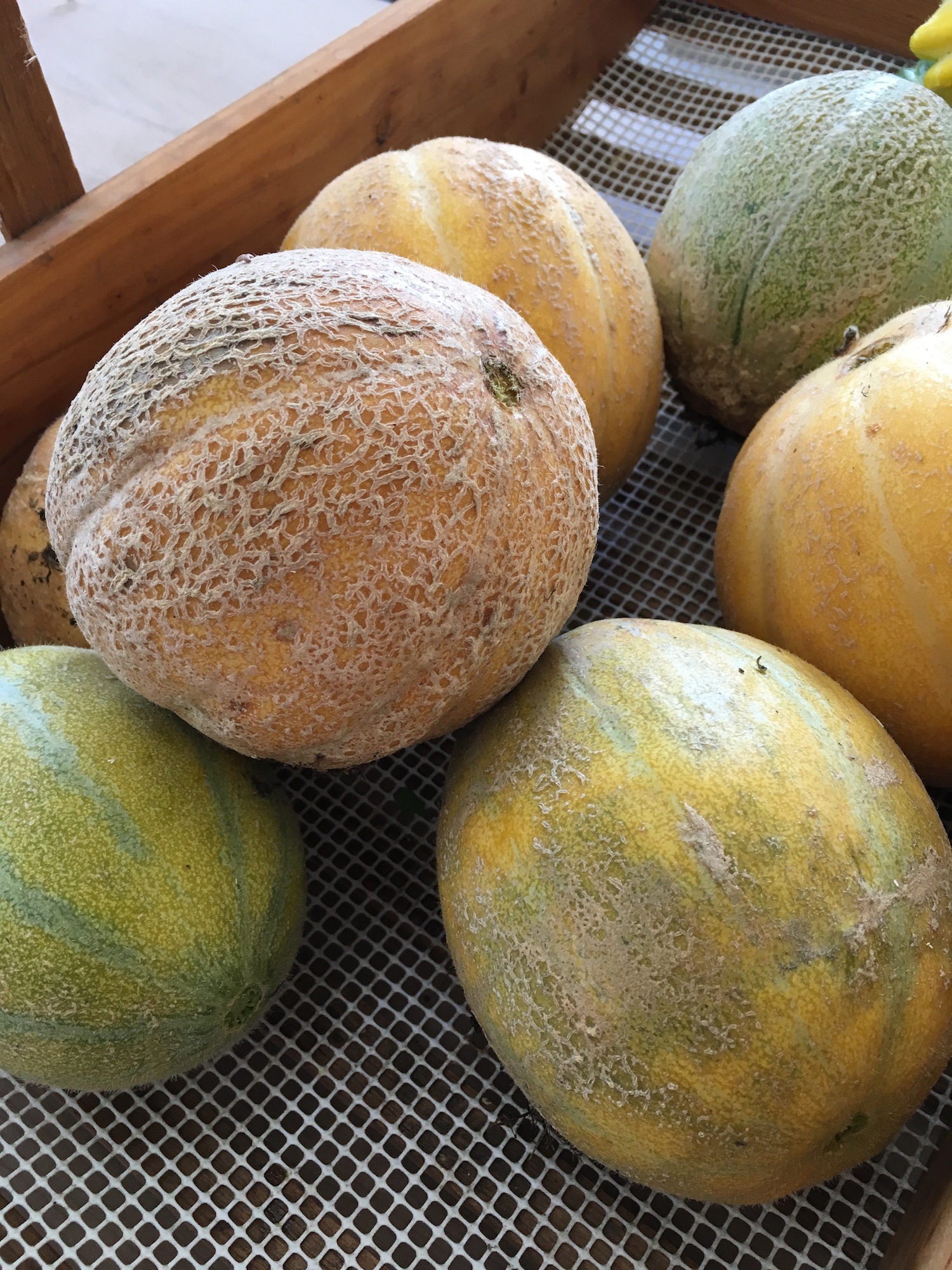 I brought seven dead-ripe rock melons in from the garden yesterday afternoon. The smell in the kitchen was overpowering, and took me directly to Roots Market, a large farmers’ market in Lancaster County PA, on a hot July day.