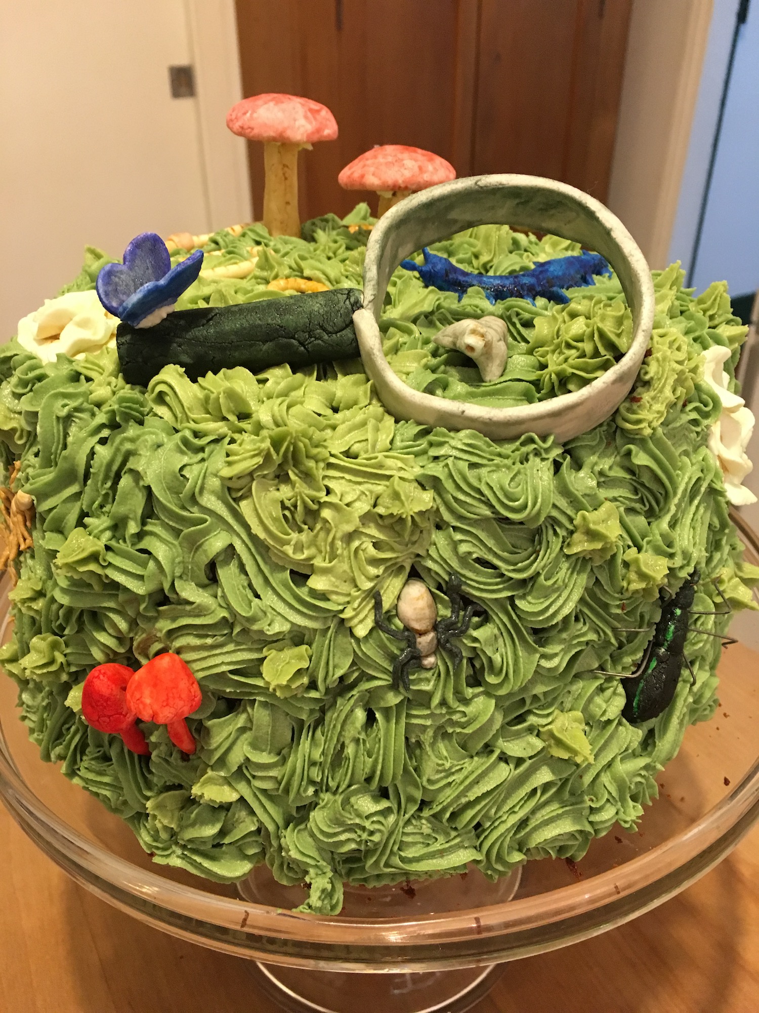 The girl asked for ‘a mossy hummock with life’ this year. I had fun creating invertebrates and fungi from Mexican paste. In hindsight, I should have made more critters—when it came time to place them on the cake, it felt sparsely populated. But the final effect was fun, and the overly decadent chocolate cake underneath was spectacular.