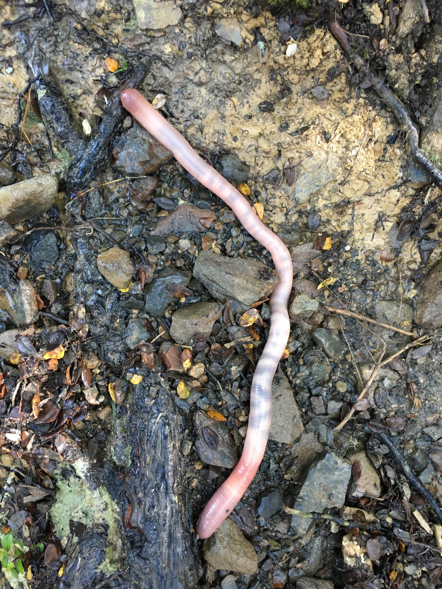 We were lucky enough to find this native worm on Mount Oxford over the weekend. I can’t positively identify the species, but it’s likely to be Octochaetus multiporus. This was a young specimen—not yet reproductive age (as evidenced by its lack of a clitellum)—but already about 20 cm (8 in) long and as thick as my pinky finger. This particular species grows to about 30 cm (12 in) long.
