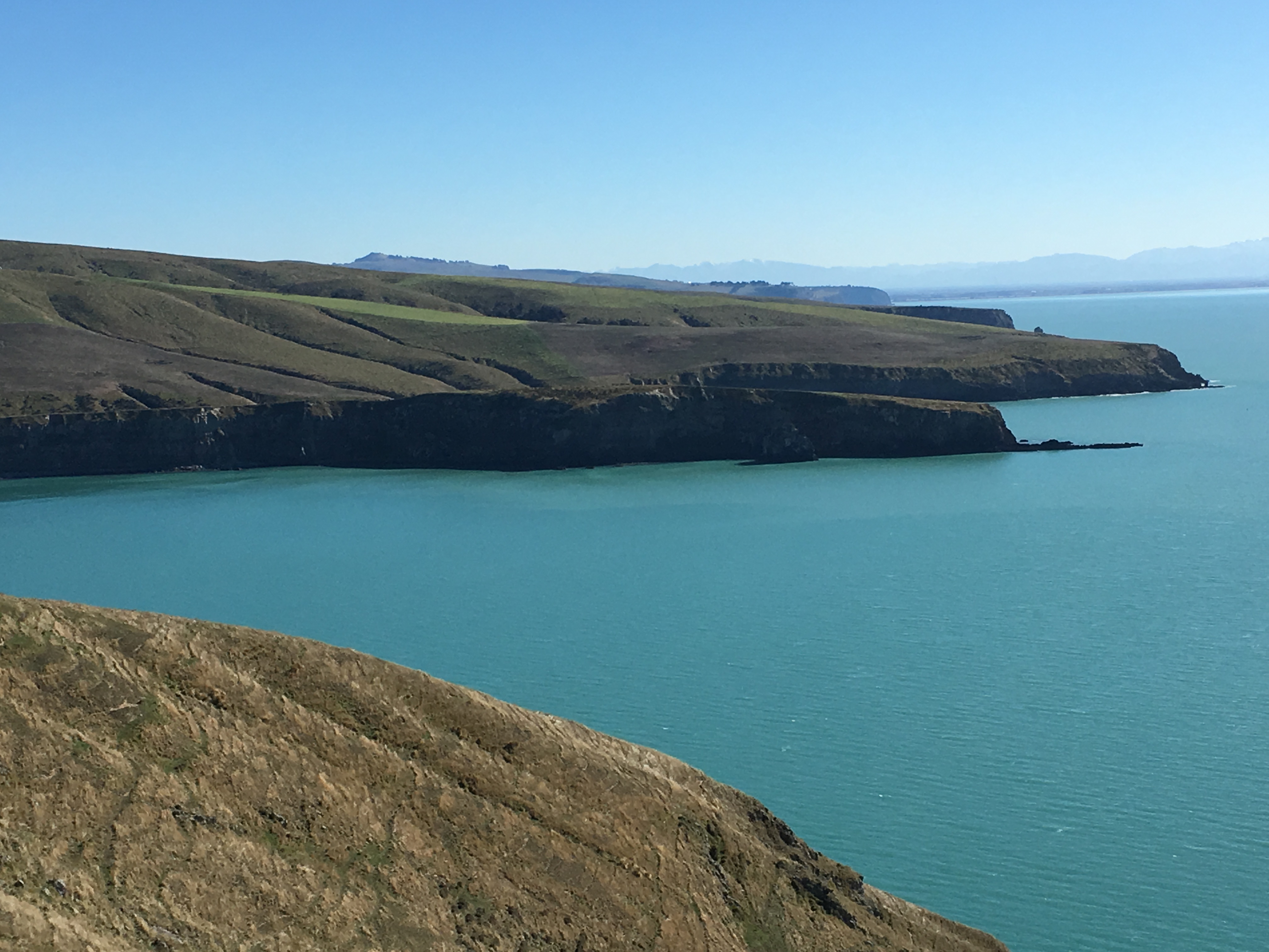 Out on the head, the cliffs are quite spectacular, and you can see the layers of volcanic deposits, well-spattered with poo from the shag colonies there. In the clear air yesterday, we could see all the way to the Kaikoura ranges.