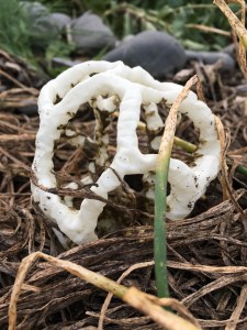 Aside from their striking look, there’s nothing particularly lovely about these fungi. The basket fungus is in the family Phallaceae, also known as the stinkhorn fungi. Members of this family—you guessed it—have a foul odour (and many are phallus-shaped). The carrion or dung-smelling fruiting bodies attract flies to disperse the spores. Supposedly, the young fruiting bodies are edible … but not very tasty, as you can imagine.