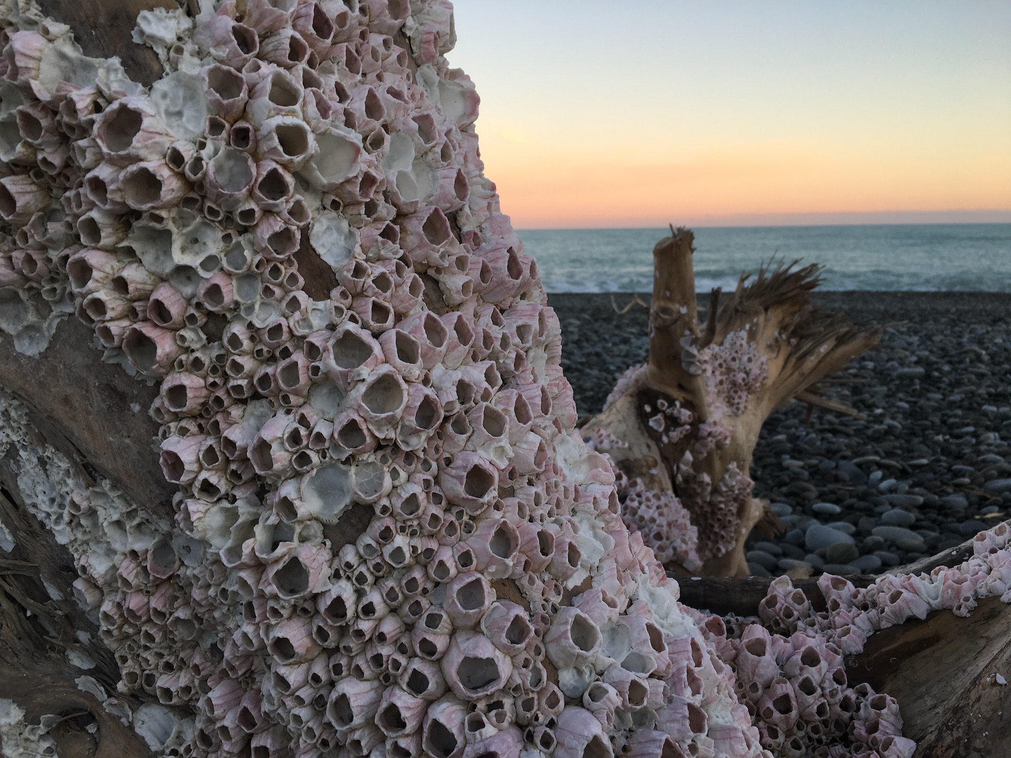 Washed up on the beach was a large tree stump crusted with barnacles whose colours mirrored the evening sky. The size and profusion of barnacles indicate the tree was lodged in the water for a long time before it was hurled onto our beach.