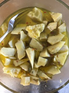 Into the bowl with the cooked artichokes went equal quantities of cider vinegar and water until the vegetables were mostly covered. Then I added a sprinkling of red pepper flakes, some ground dried garlic (because I had none fresh), and a handful of chopped fresh oregano. I poured olive oil over the whole thing until the artichokes were completely covered by liquid, and then I stirred to mix it all.