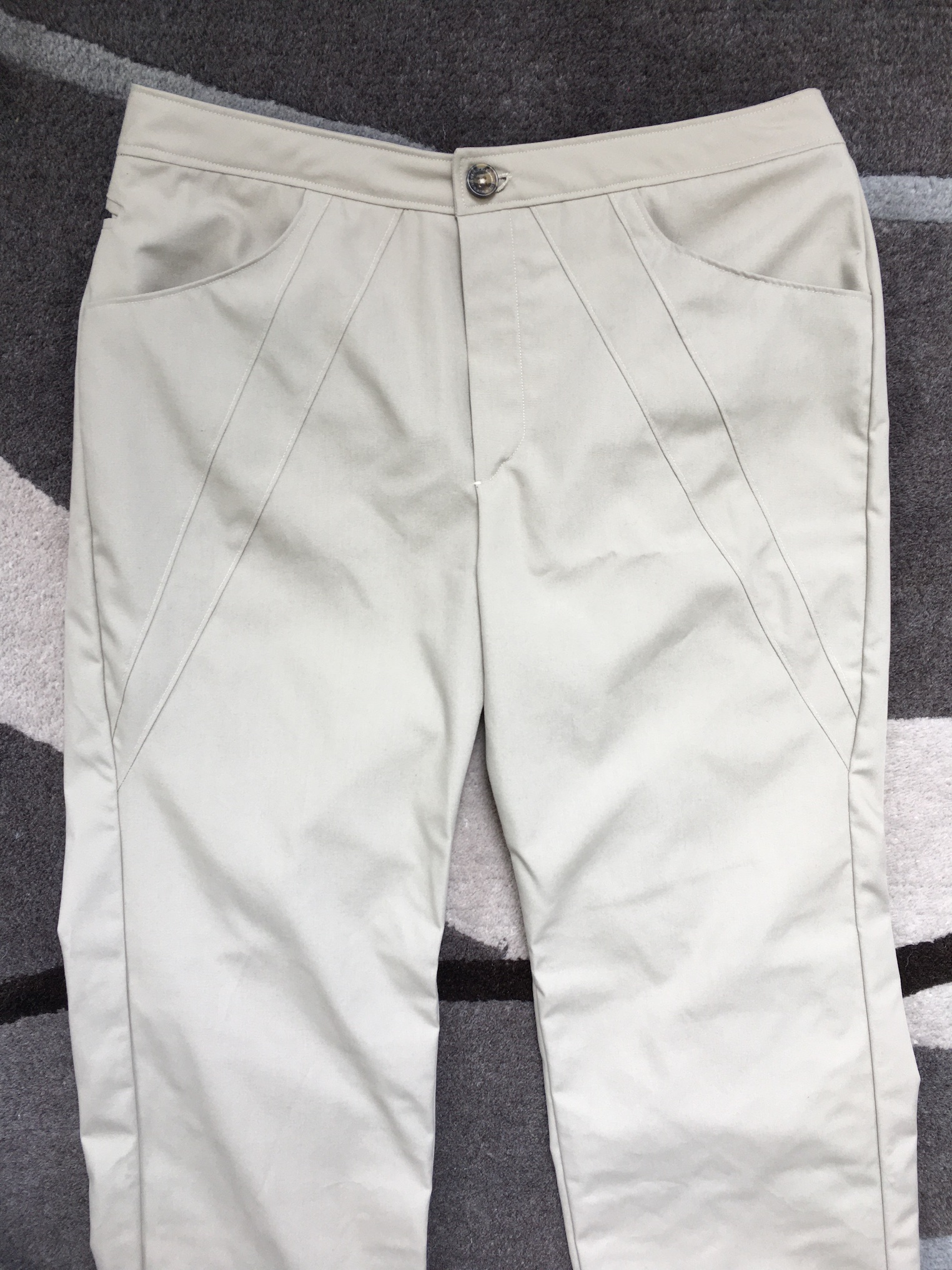 Maybe I could do something similar with these trousers. I drafted several inserts of various shapes. I didn’t like any of them, because they all destroyed the look I wanted. But the alternative was to throw the garment away.