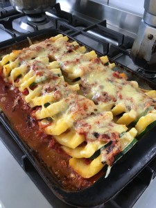 When all the components are ready, oil a 23×33 cm (9×13-inch) baking pan. Cut polenta into about 24 squares. Layer polenta squares, tomato sauce, and zucchini rounds in sideways ‘stacks’ to fill the pan. Pour over the remaining tomato sauce and top with cheese. Bake for 30 minutes.