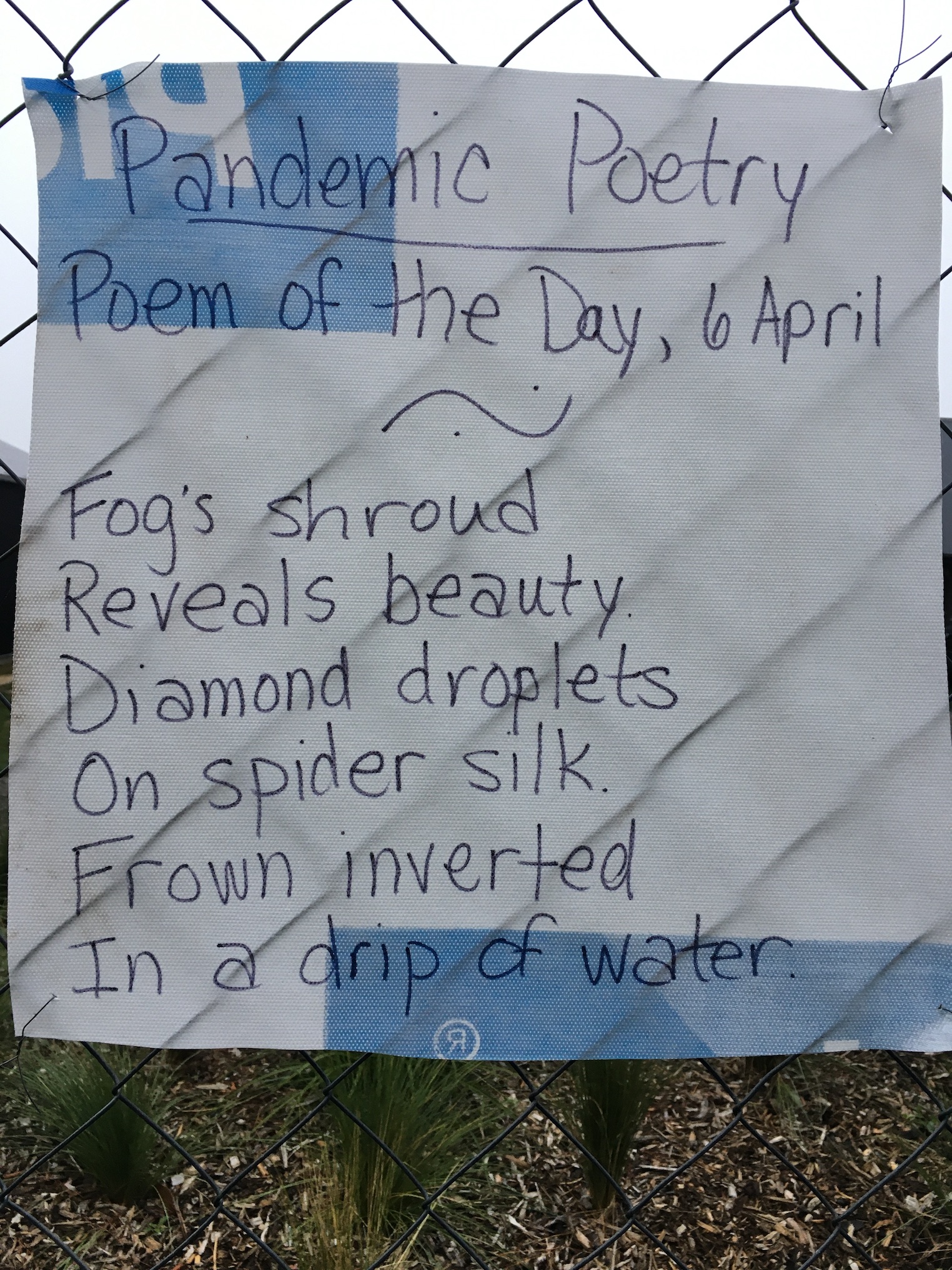 Pandemic Poetry: Poem of the Day, 6 April 2020 April 6, 2020 / Robinne Weiss The forecast is for sun, but this morning dawned foggy and damp. Discover more from Robinne Weiss Subscribe to get the latest posts sent to your email. Type your email… Subscribe Share this: Click to share on X (Opens in new window) X Click to share on Facebook (Opens in new window) Facebook Click to email a link to a friend (Opens in new window) Email Click to share on Pinterest (Opens in new window) Pinterest Click to share on LinkedIn (Opens in new window) LinkedIn Click to share on Reddit (Opens in new window) Reddit Click to share on Tumblr (Opens in new window) Tumblr Like Loading... Related