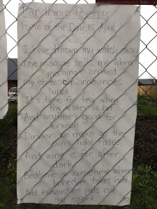 I put today’s poem up in pouring rain, and the fence was a little too visible against the wet building wrap, so here’s today’s poem typed out, in case you can’t read it on the photo: