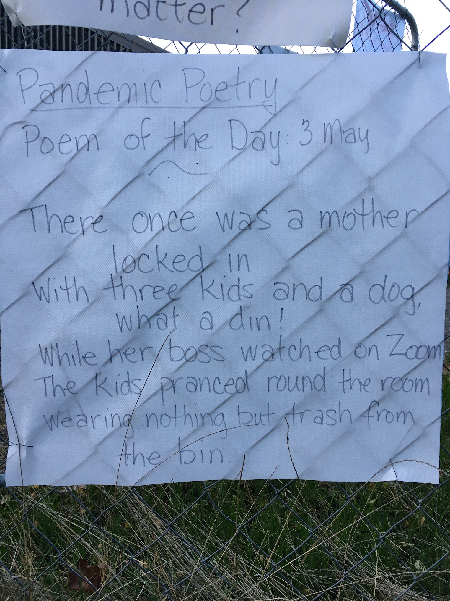 Pandemic Poetry: Poem of the Day, 3 May 2020 May 3, 2020 / Robinne Weiss Another glorious day of sun. I know it will end (sooner rather than later), but I’ll take every lovely day I can at this point. Discover more from Robinne Weiss Subscribe to get the latest posts sent to your email. Type your email… Subscribe Share this: Click to share on X (Opens in new window) X Click to share on Facebook (Opens in new window) Facebook Click to email a link to a friend (Opens in new window) Email Click to share on Pinterest (Opens in new window) Pinterest Click to share on LinkedIn (Opens in new window) LinkedIn Click to share on Reddit (Opens in new window) Reddit Click to share on Tumblr (Opens in new window) Tumblr Like Loading... Related