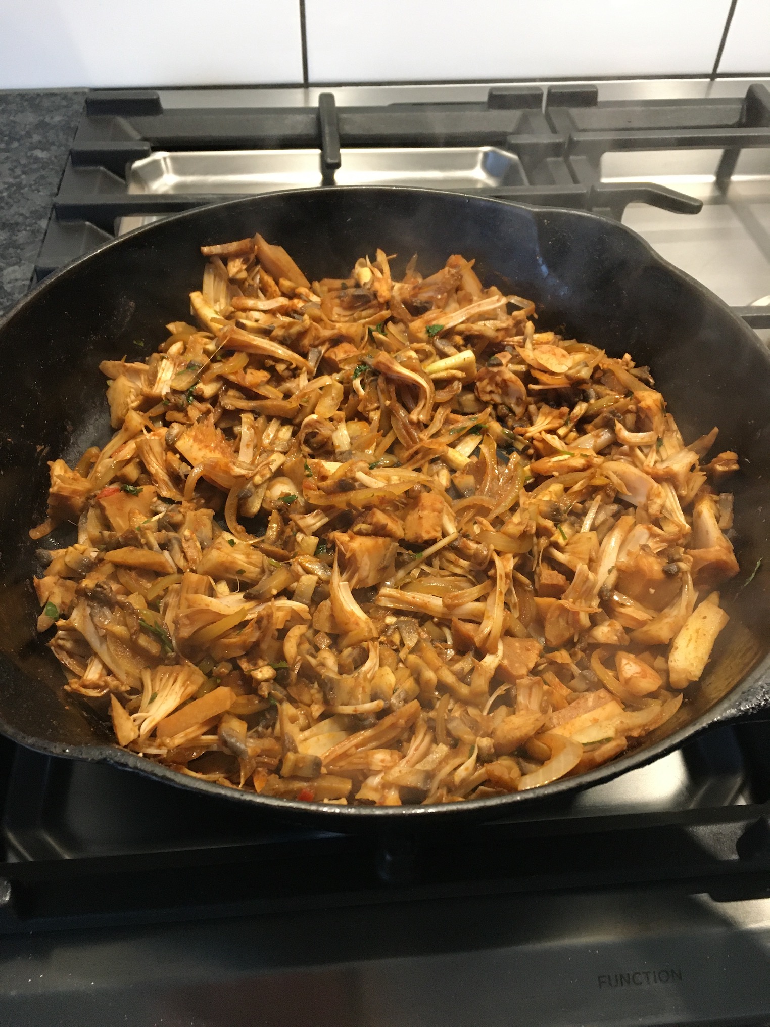 Then I made a hash of shredded jackfruit, mushrooms and onions, heavily spiced with paprika, smoked paprika, and chipotle. A dash or two of vegetarian Worcestershire sauce gave it a little tang, and a handful of fresh cilantro tipped it towards Asian flavours.