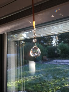 In summer, the sun is too high to hit the crystal—it’s shaded by the eaves. I could hang the crystal lower, so it made rainbows all year, but I like to think the rainbows are winter’s gift to me. They’re something to look forward to during these short days.