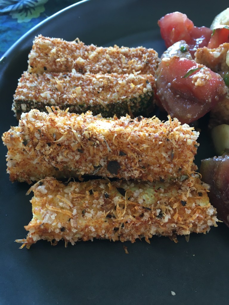 One of my favourite ways to eat zucchini is as breaded, oven fried sticks. These tasty ‘fries’ take a little work, but are well worth the effort. I fill a large jelly roll pan with them, and they vanish, even when it’s just my husband and me for dinner.