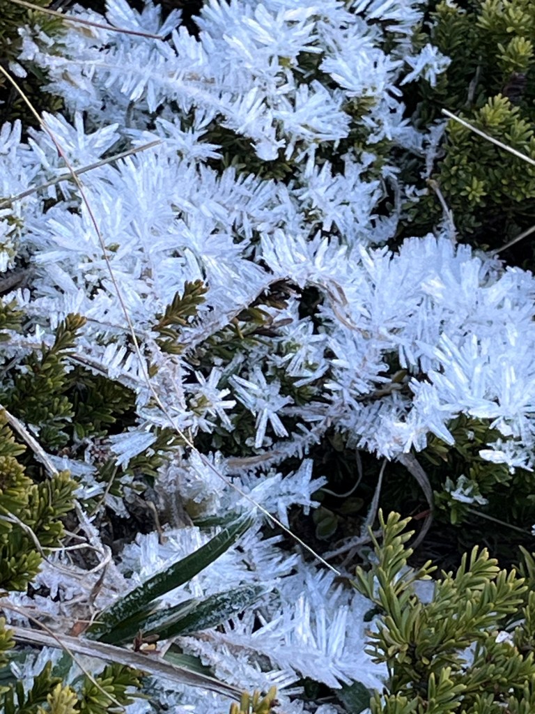 Still, winter hiking was in its full glory. On the way up, we hiked across crunchy frozen mud, pushed up by countless ice needles. We teetered on icy tussock mounds as we crossed a wetland. As we gained altitude, the wind increased and the temperature fell. We passed pockets of spectacular frost, with ice crystals so long, it looked like leaves. Snow in the shady hollows was wind sculpted and hard, more ice than snow.