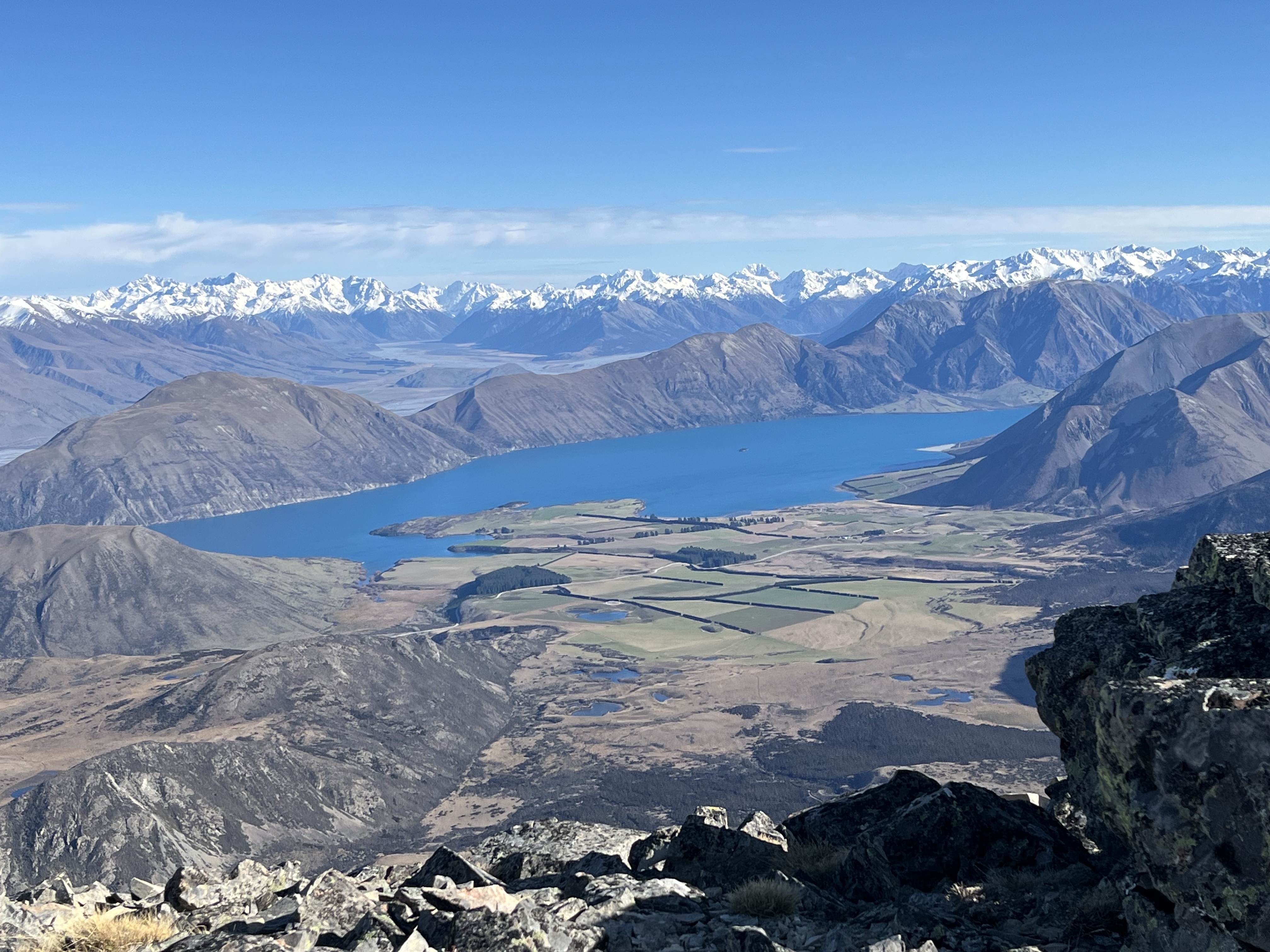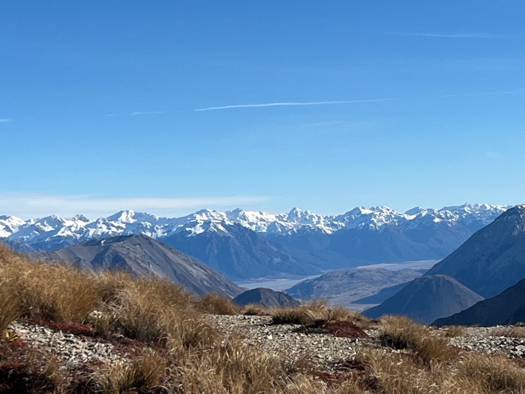 The view from the top was definitely worth the windburn. Winter mountains—covered in snow—stretched across the skyline. Down below us, the water of Lake Coleridge glistened blue in the sun.
