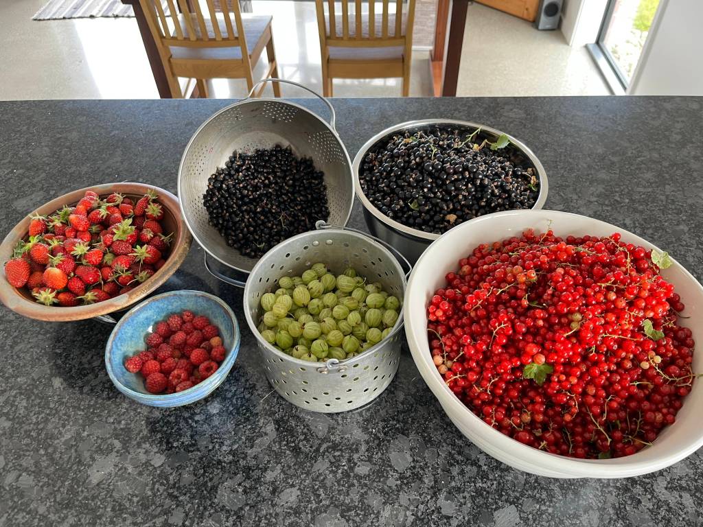 In the past two weeks, we have picked and processed (or eaten) 26.6 kg of fruit. Mostly strawberries, raspberries, black currants, red currants and gooseberries, but also a few cherries and boysenberries.