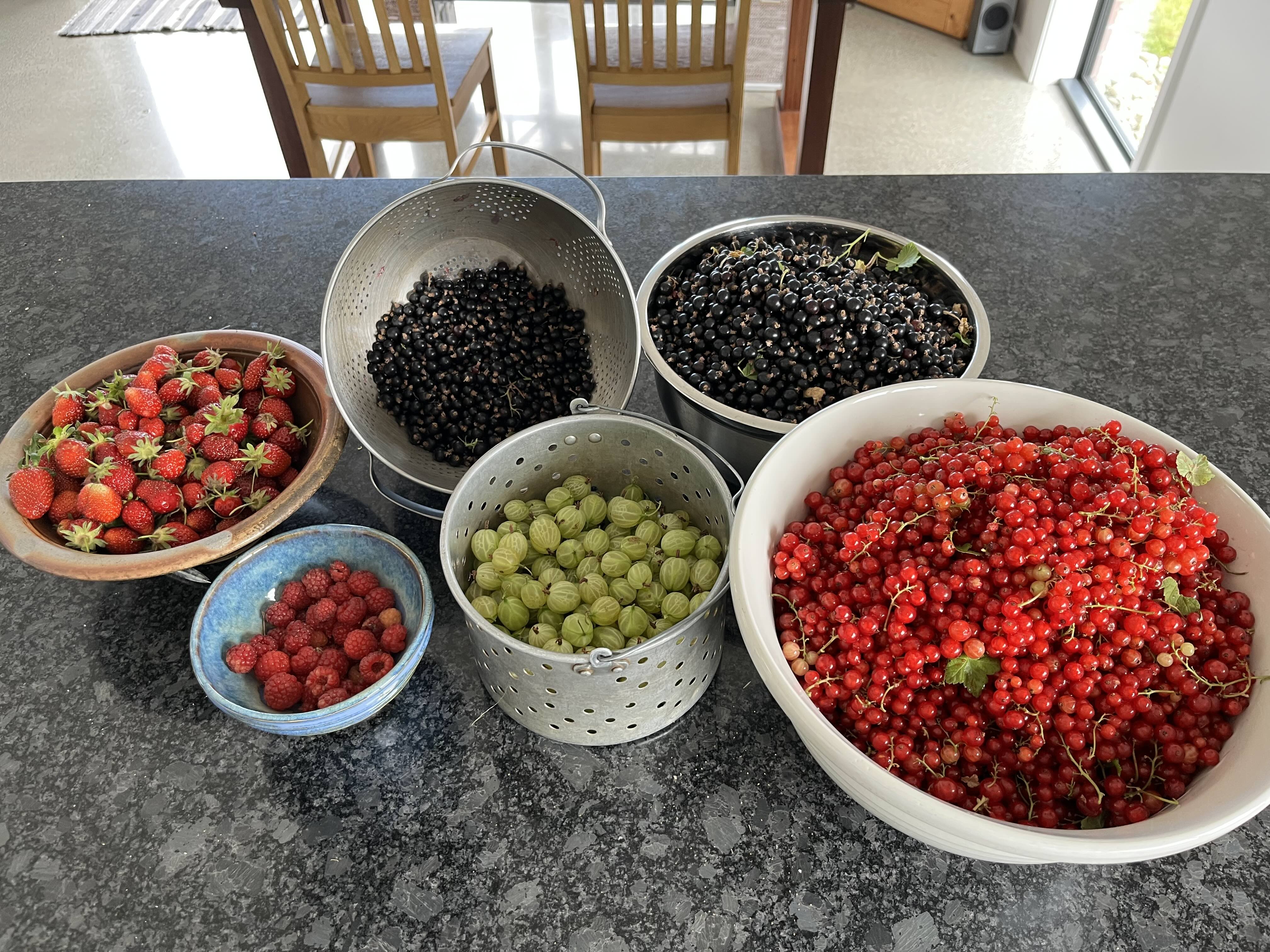 In the past two weeks, we have picked and processed (or eaten) 26.6 kg of fruit. Mostly strawberries, raspberries, black currants, red currants and gooseberries, but also a few cherries and boysenberries.
