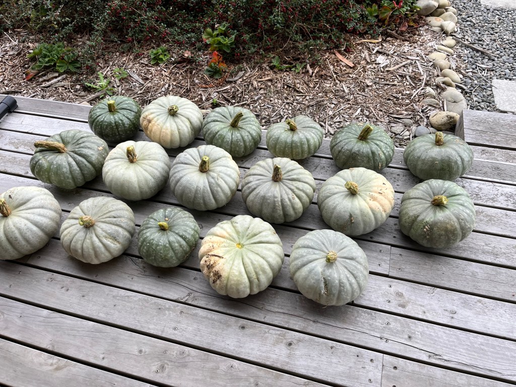 - The volunteer pumpkins—the pumpkins I actually planted were marginal and were nailed by powdery mildew. But the two volunteer pumpkins—out on their own with good air flow around them—did well. One of them, in particular, was the most spectacular plant I’ve ever seen—the plant itself was enormous, and it produced 17 pumpkins with a total weight of 41.6 kg!