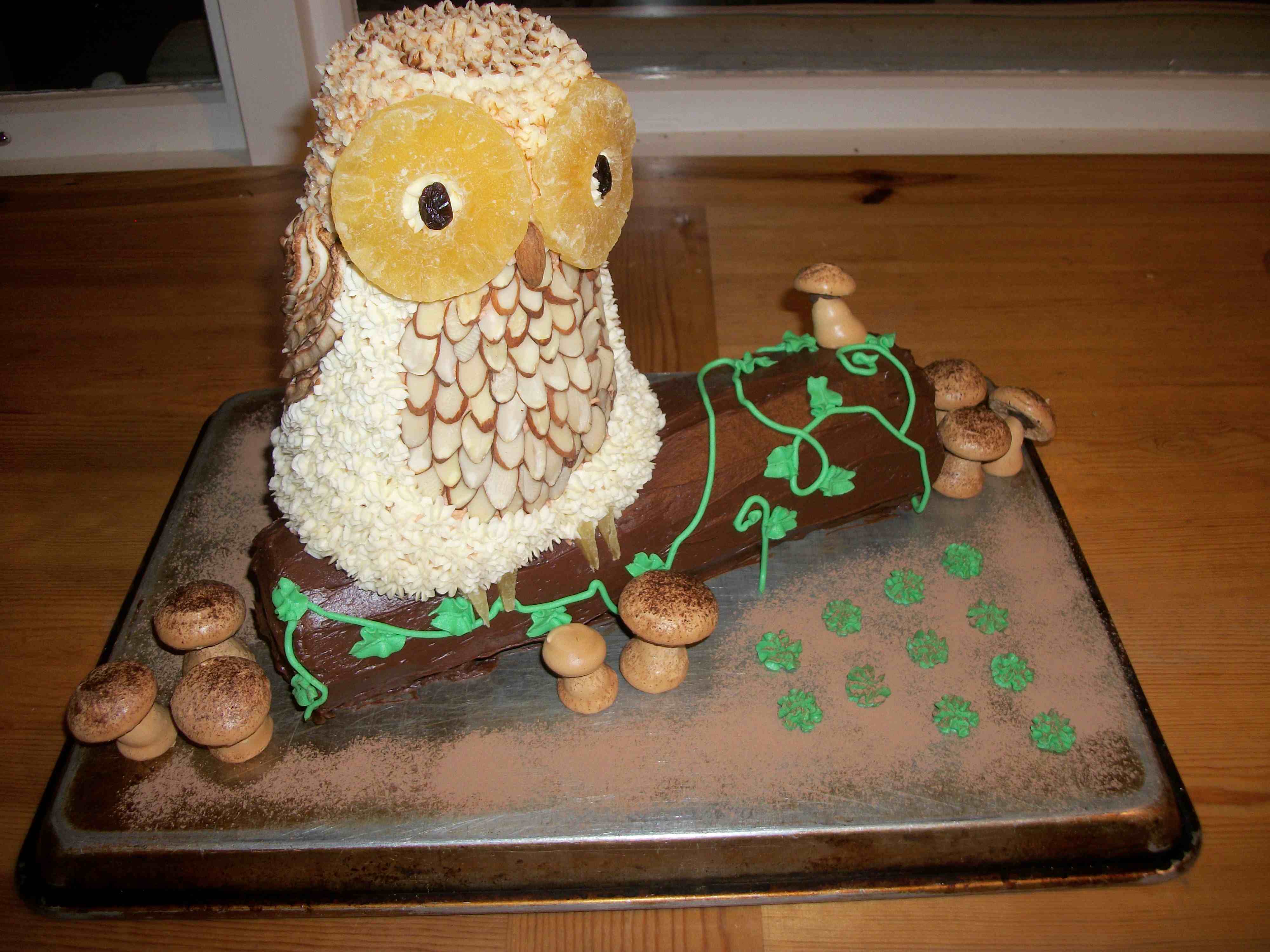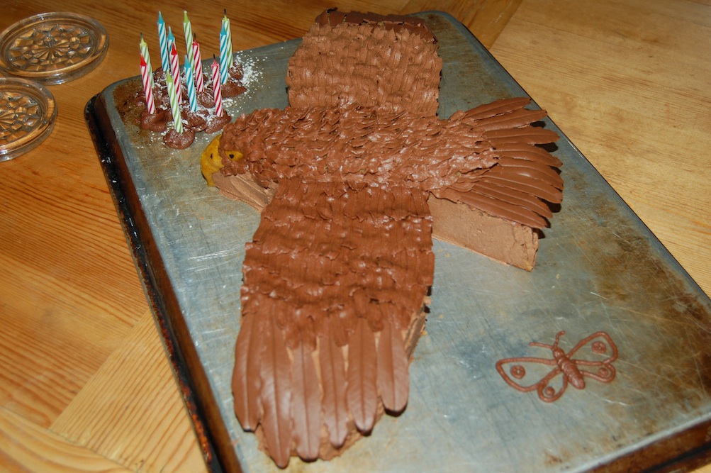 2013: A dual birthday party cake–the spice cake owl was for my son, the chocolate log, for my daughter. I had always wanted to make meringue mushrooms…