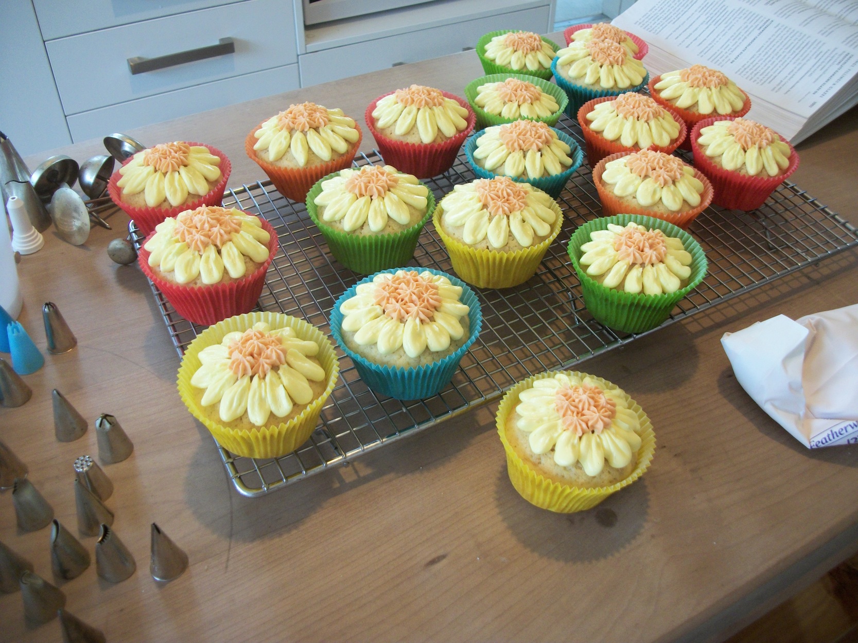 It’s a drizzly, dark day. The whole family slept in this morning (well, apart from me), and they still all rose before sunrise. It was a day to either stay in bed or do something to banish the winter blues. So I made lemon cupcakes iced with bright yellow flowers—my kitchen is sunny, even if the sky is grey!