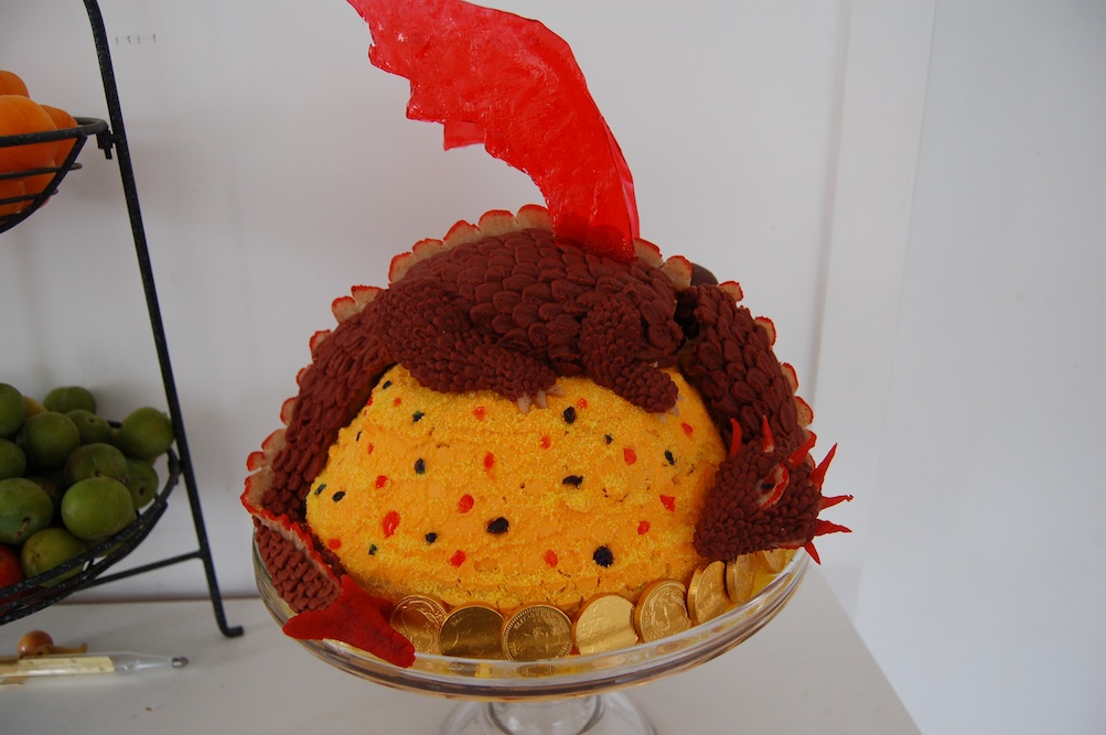 2014: My marzipan, cake, and candy triumph—Smaug was the joint birthday party cake. Tail, neck, head, and legs sculpted from marzipan, clear candy wings and jewels studding the treasure pile.