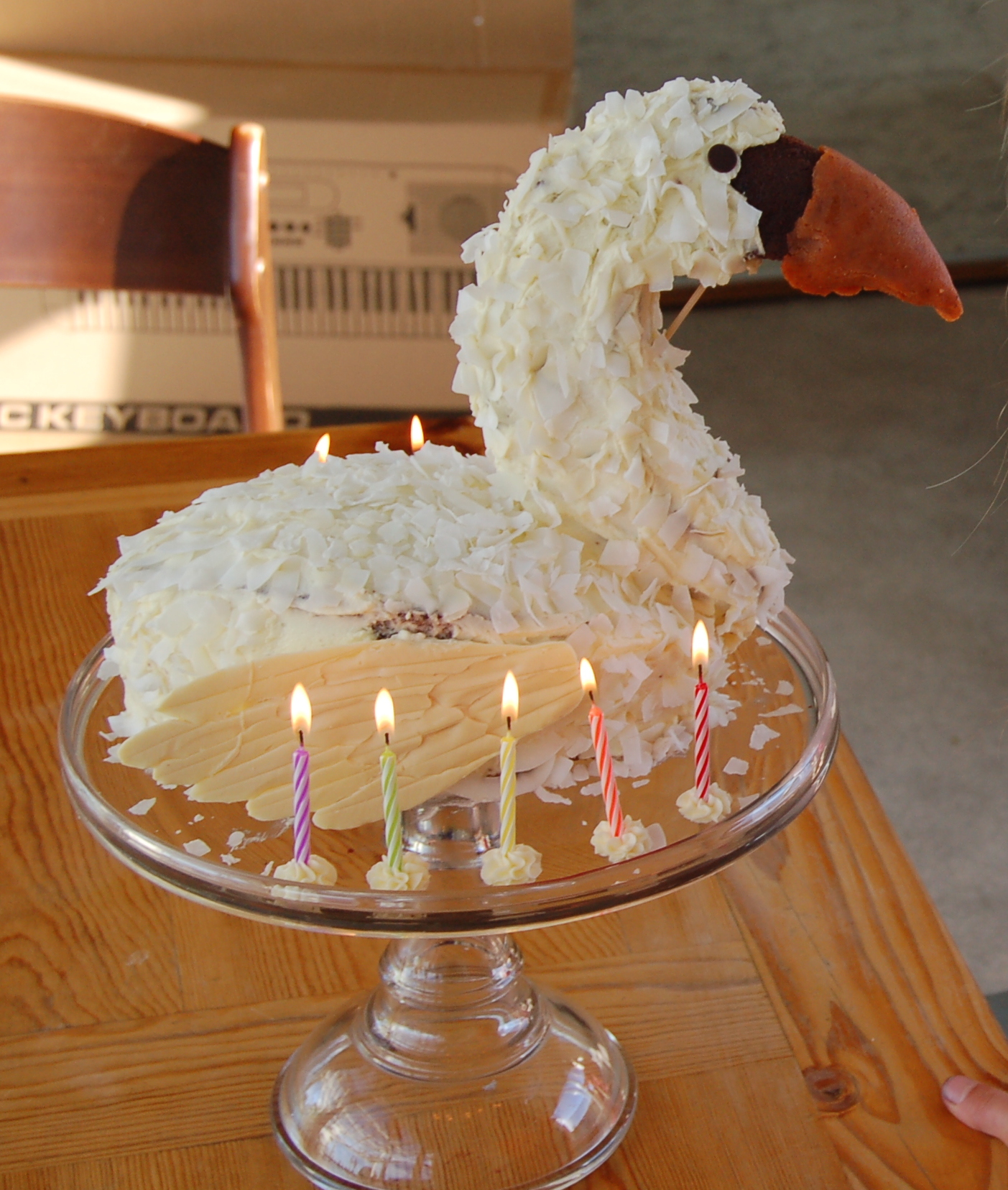 2014: The swan used more chocolate painted leaves—white chocolate this time, which managed the heat a little bit better than the dark chocolate (though the icing holding the wing to the body did not). It was also my first, not so attractive, foray into marzipan (for the beak).