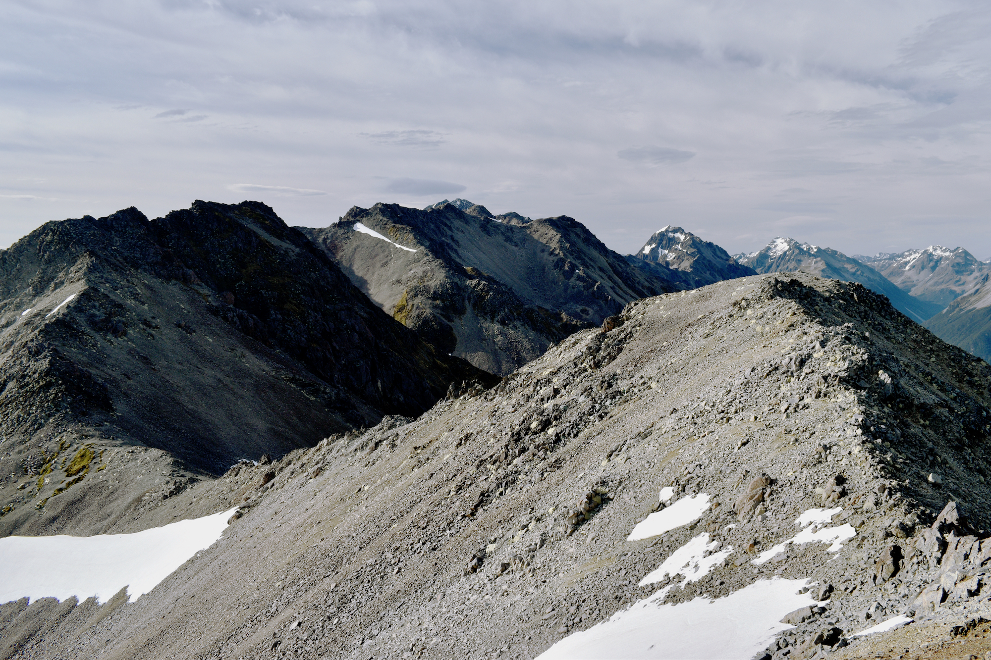 Day 3, Christmas Day, dawned lightly overcast—perfect for the next stage of the hike, over Gillespie Pass. The track climbs steeply over 1000 metres to the pass, first through the forest, and then into alpine scrub and tussock. Mount Awful looms over the pass, and the surrounding landscape is dominated by jagged peaks and glaciers. The taller peaks, including Mount Awful, were shrouded in cloud, but the views were nonetheless spectacular. We even got a slightly white Christmas, hiking through a couple of snow patches near the top of the pass.