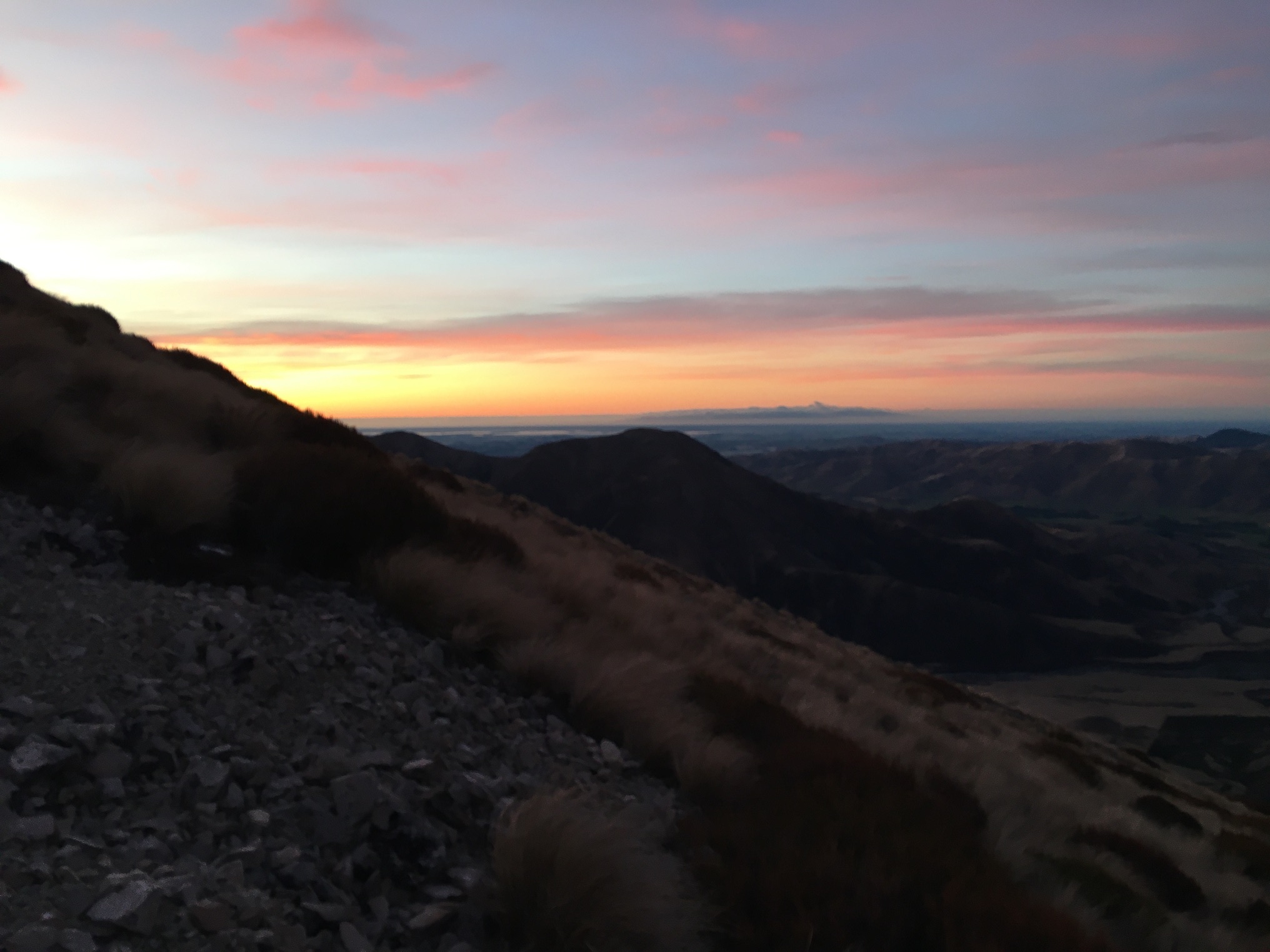 Spending time with whānau wasn’t an option for me today, so I thought I’d celebrate my connections to the seasons and the Earth instead. Before dawn I drove to Porter’s Pass and hiked up towards Foggy Peak. It was dark when I began the ascent, with just a hint of light to the east. I hiked the first 40 minutes or so with my head torch, before it was light enough to see the track.