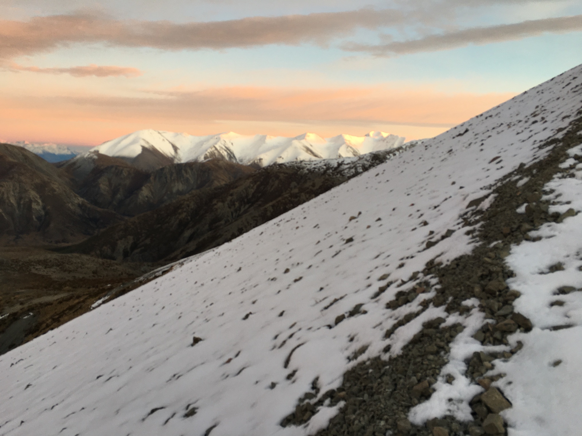 I’d hoped to catch the sunrise from the summit of Foggy Peak, but as the scree gave way to icy snow, my progress slowed, and I wished for crampons. I watched sun strike the snowy peaks of the Craigieburn Range and decided that that would have to be good enough—I could push on to Foggy Peak, but I wasn’t going to sit there with a cup of tea and watch the sun rise as I’d hoped. Even if I’d been in time, it was too windy and cold.