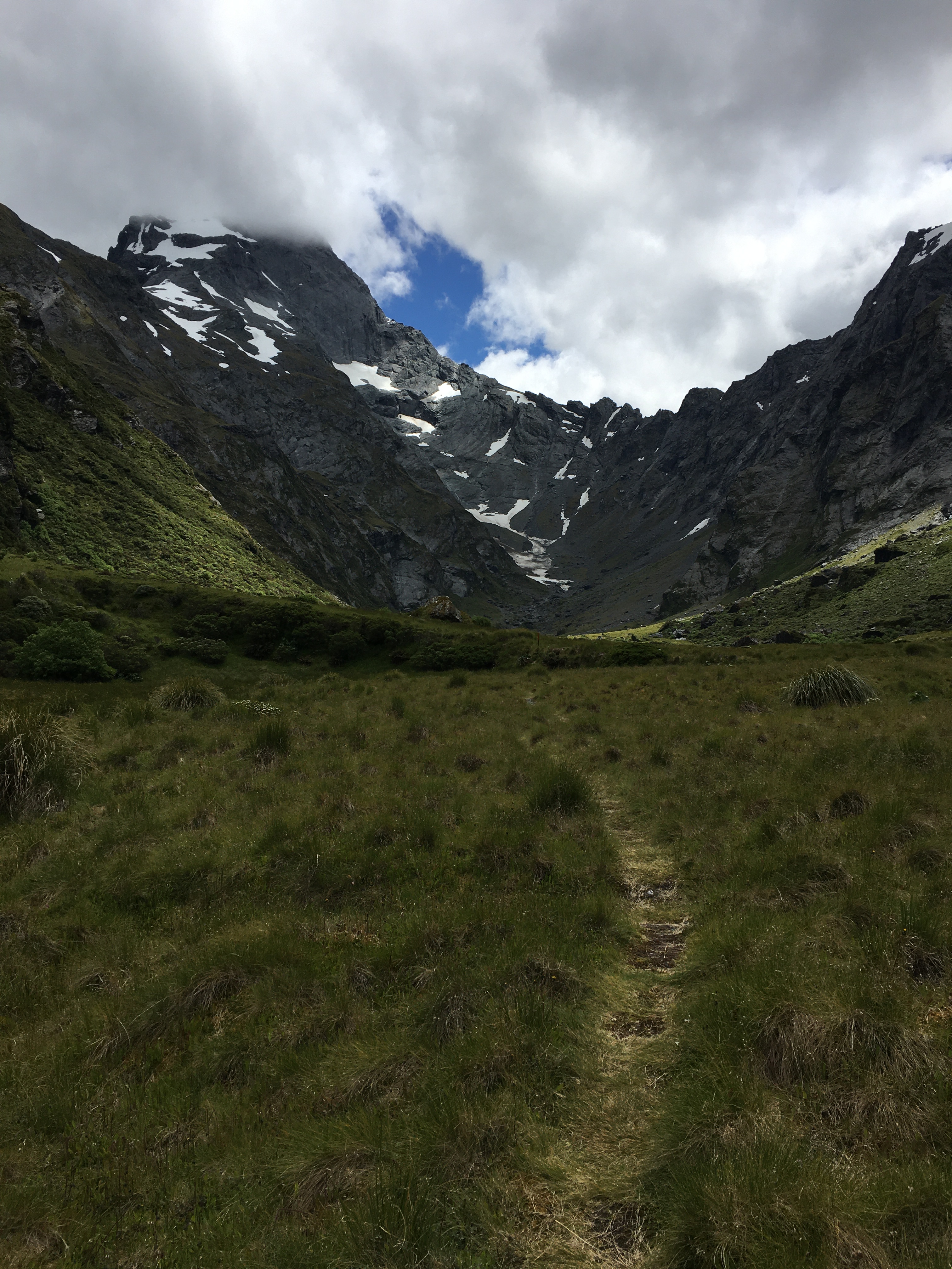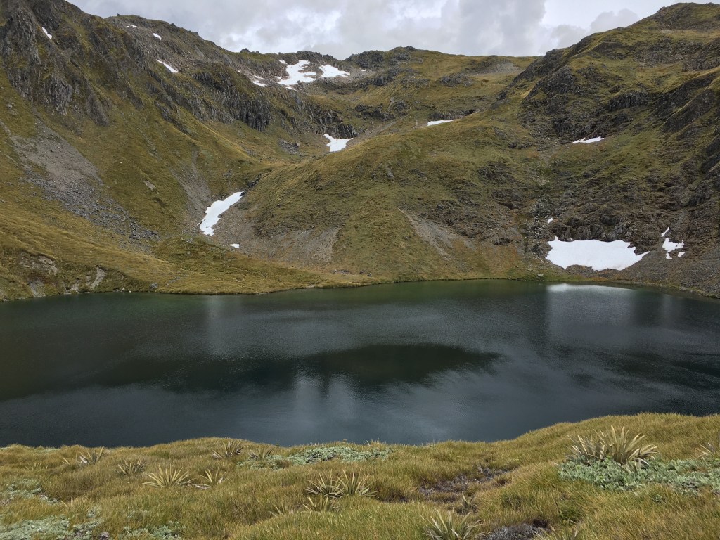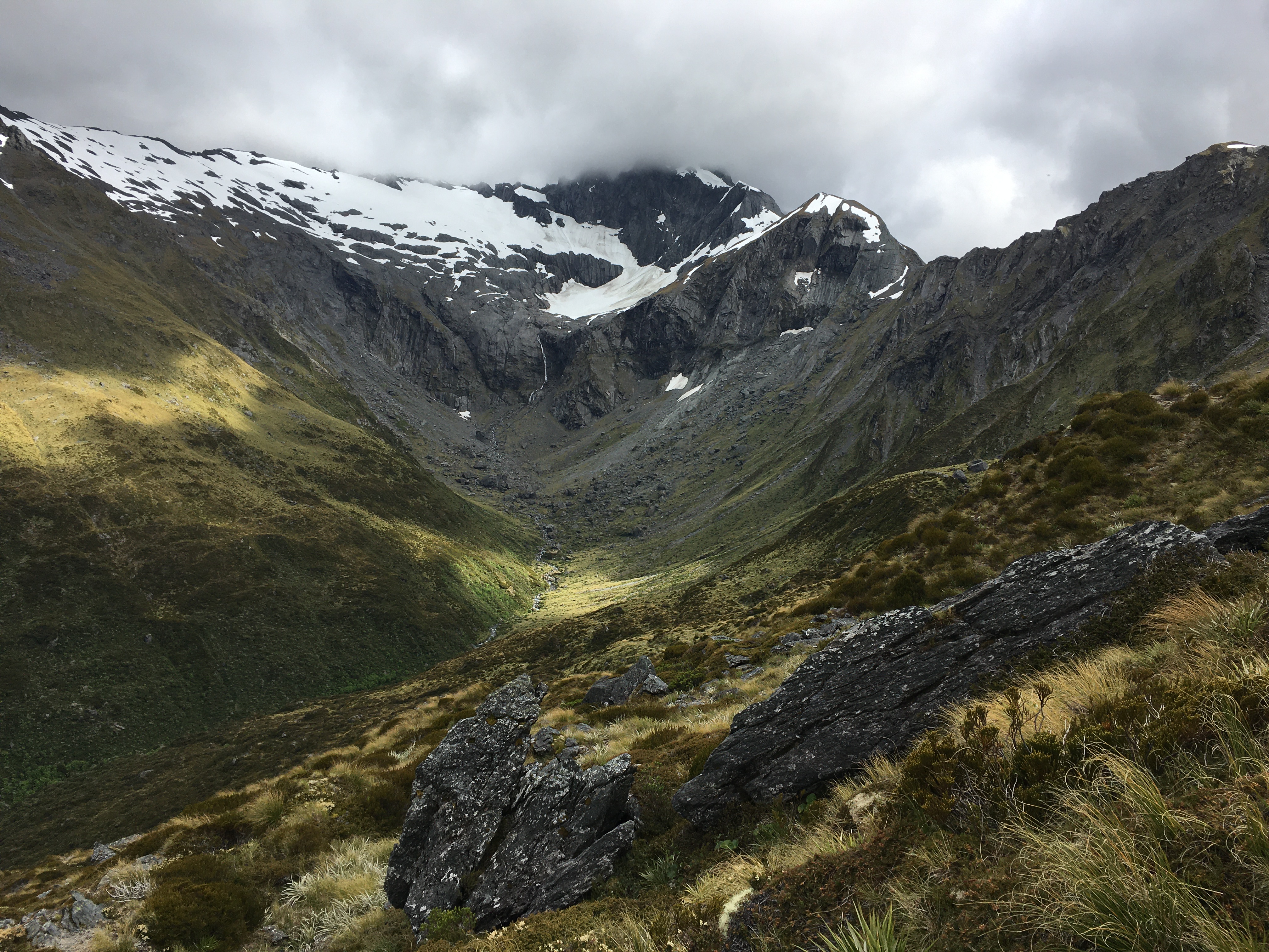 Day 3, Christmas Day, dawned lightly overcast—perfect for the next stage of the hike, over Gillespie Pass. The track climbs steeply over 1000 metres to the pass, first through the forest, and then into alpine scrub and tussock. Mount Awful looms over the pass, and the surrounding landscape is dominated by jagged peaks and glaciers. The taller peaks, including Mount Awful, were shrouded in cloud, but the views were nonetheless spectacular. We even got a slightly white Christmas, hiking through a couple of snow patches near the top of the pass.