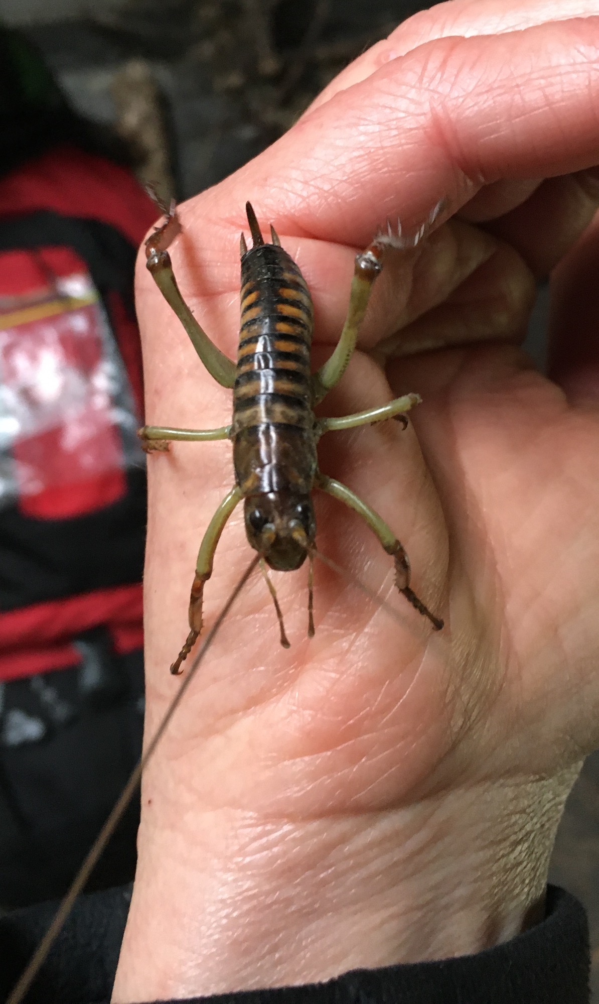 Once at the Doubtful River, a cruisy 40-minute hike took us up to the confluence with the Doubtless River, and shortly thereafter, to the Doubtless Hut, where we had a spacious six bunks to ourselves. Well, almost to ourselves. As we were packing up to leave, we found a beautiful young female Wellington tree wētā in the hut.