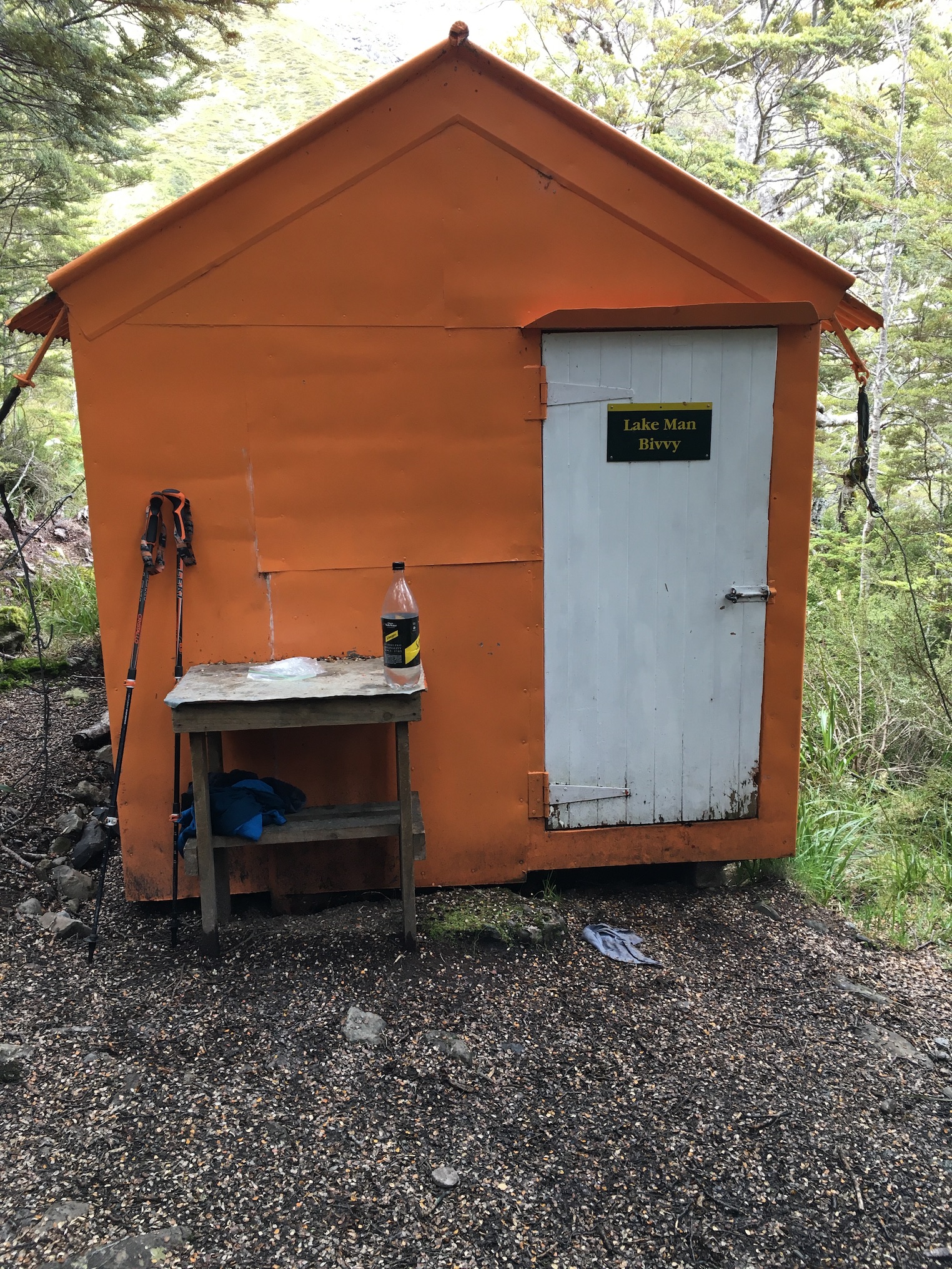On day 3 we climbed up to Lake Man Biv—another 2-person hut, thankfully with a little more camping space nearby. Lake Man Biv is hobbit-sized. The door is about three-quarters height, and the bunks were so short, even 160-centimetre (5-foot, two-inch) me couldn’t stretch out on them. But in spite of its size, the biv is perfectly appointed, with a small table for cooking (complete with a drawer full of cooking and cleaning supplies) a set of tiny shelves, a fold-down bench, and an empty ammo box for additional seating and mouse-proof storage. Cords along the ceiling provide clothes drying space, and there are even clothes pegs fashioned from beech tree branches. The overall effect is a tidy, fully-functional space, in spite of its size.